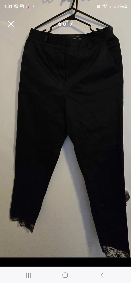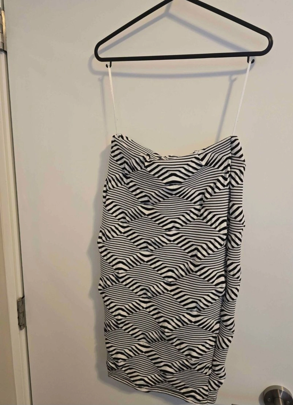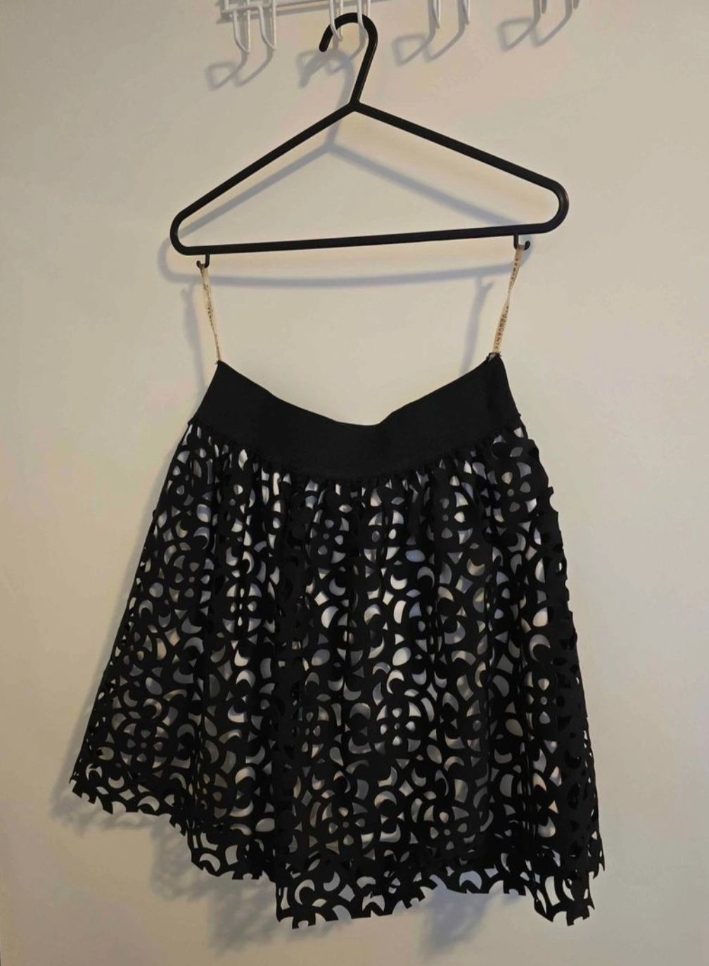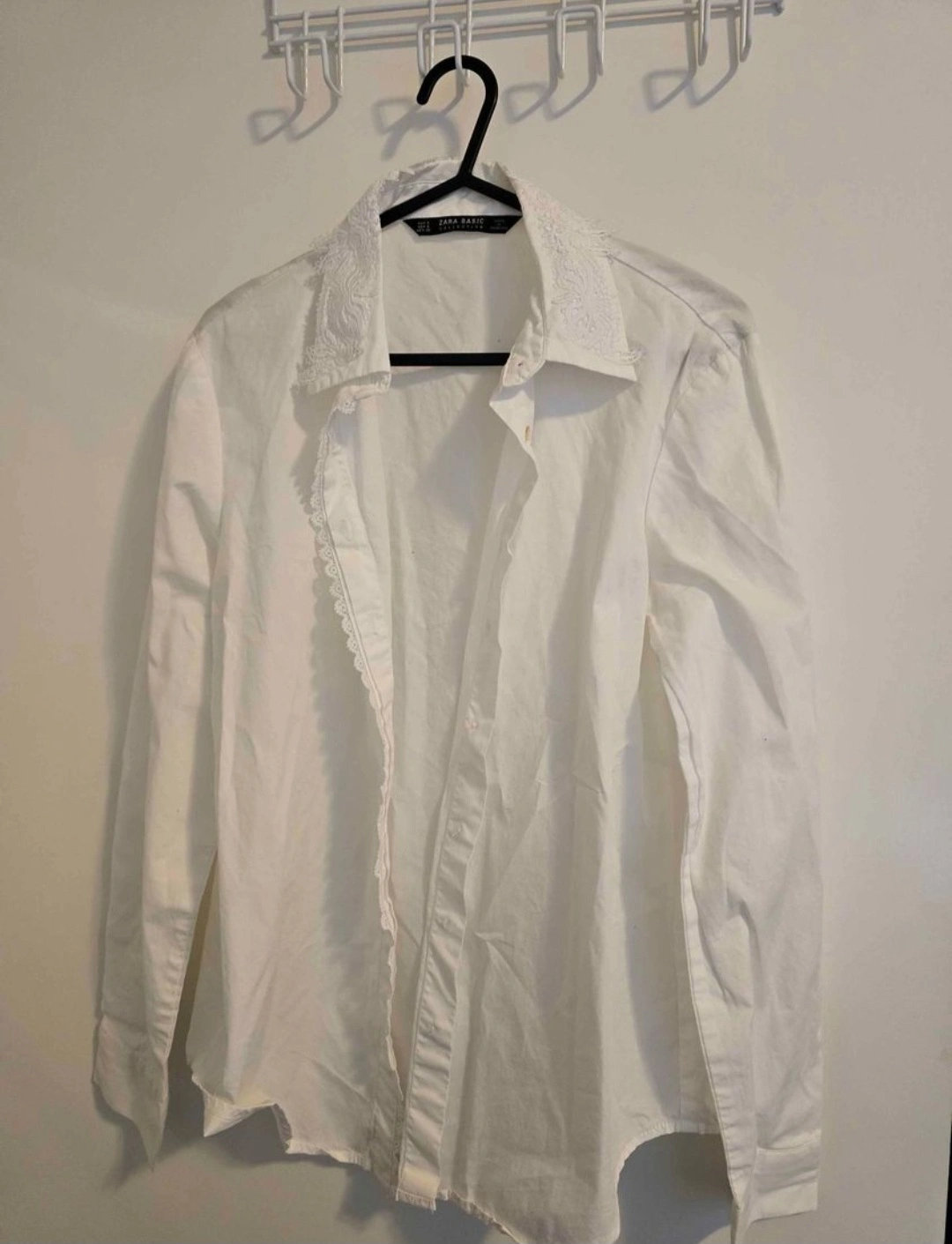 A few pieces of women's clothing, including a white Zara button-up shirt with lace detail, a black skirt with cutouts, and a black and white striped skirt.