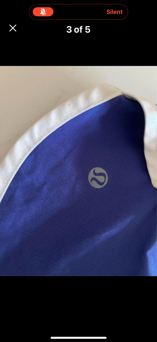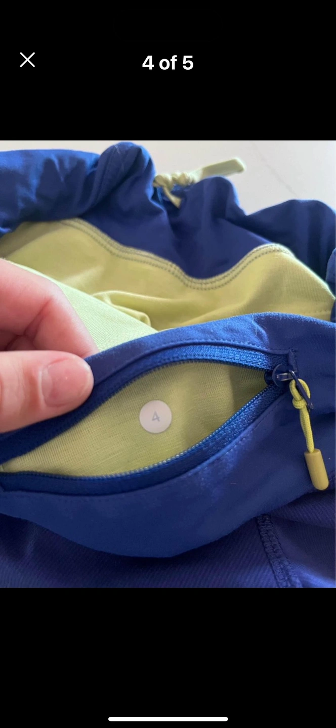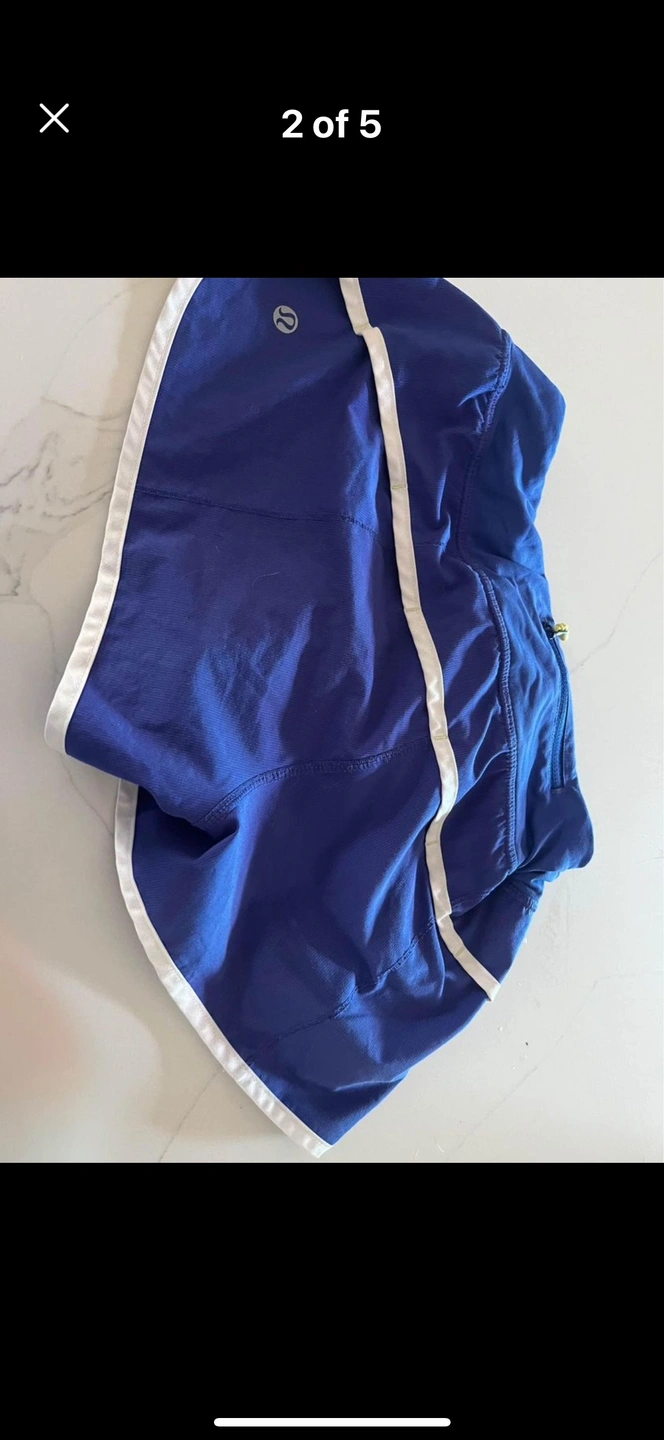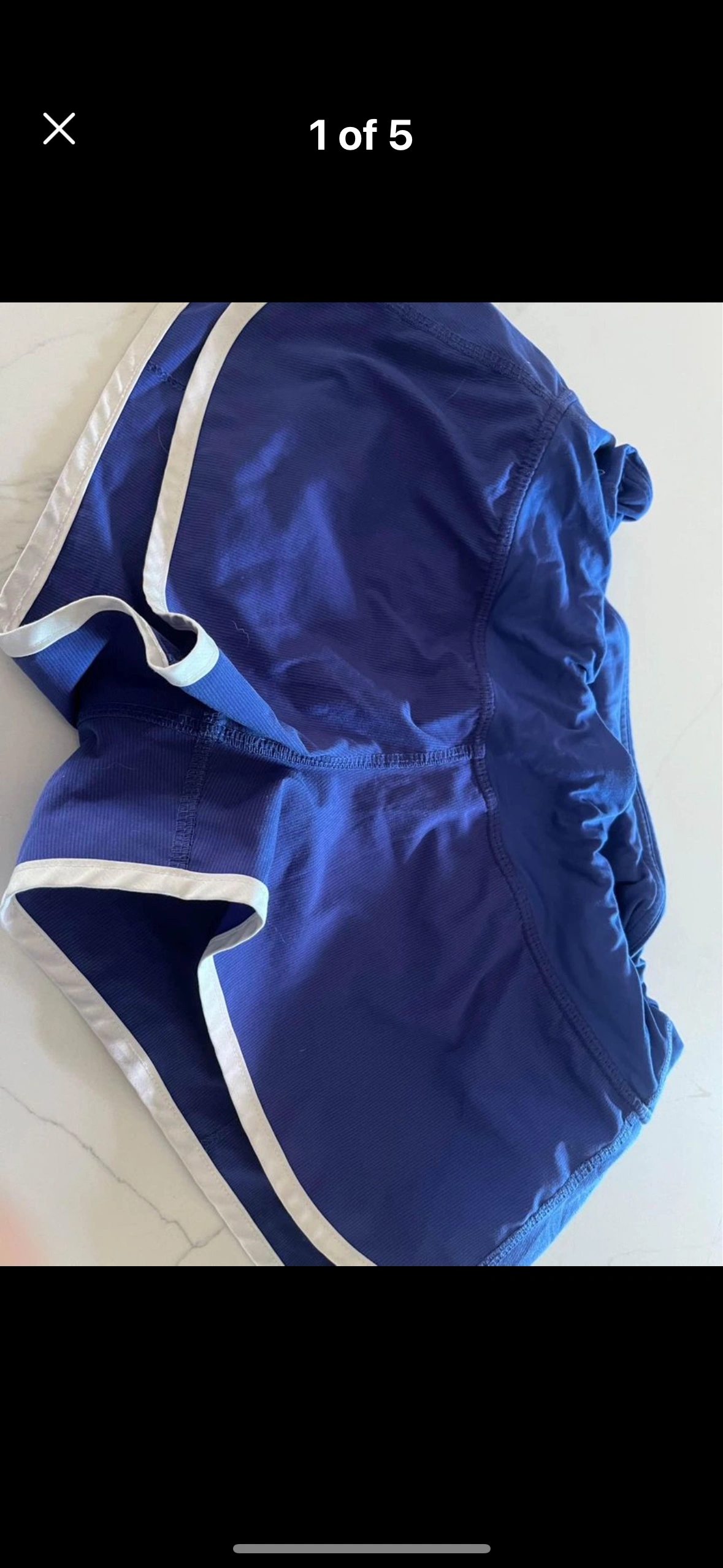 Lululemon running shorts in a navy blue with a white trim. They have a built-in liner. The size is a 4. Pick up Etobicoke