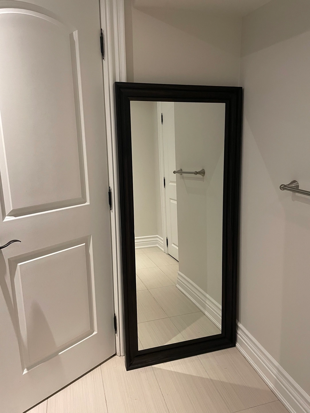 Black framed mirror with a simple design. The mirror has a clean and modern aesthetic. Never used, Would look great in a bedroom, bathroom, or entryway. It's in great condition and ready for a new home!