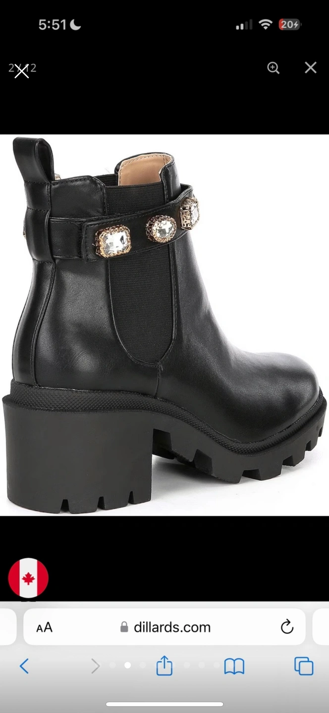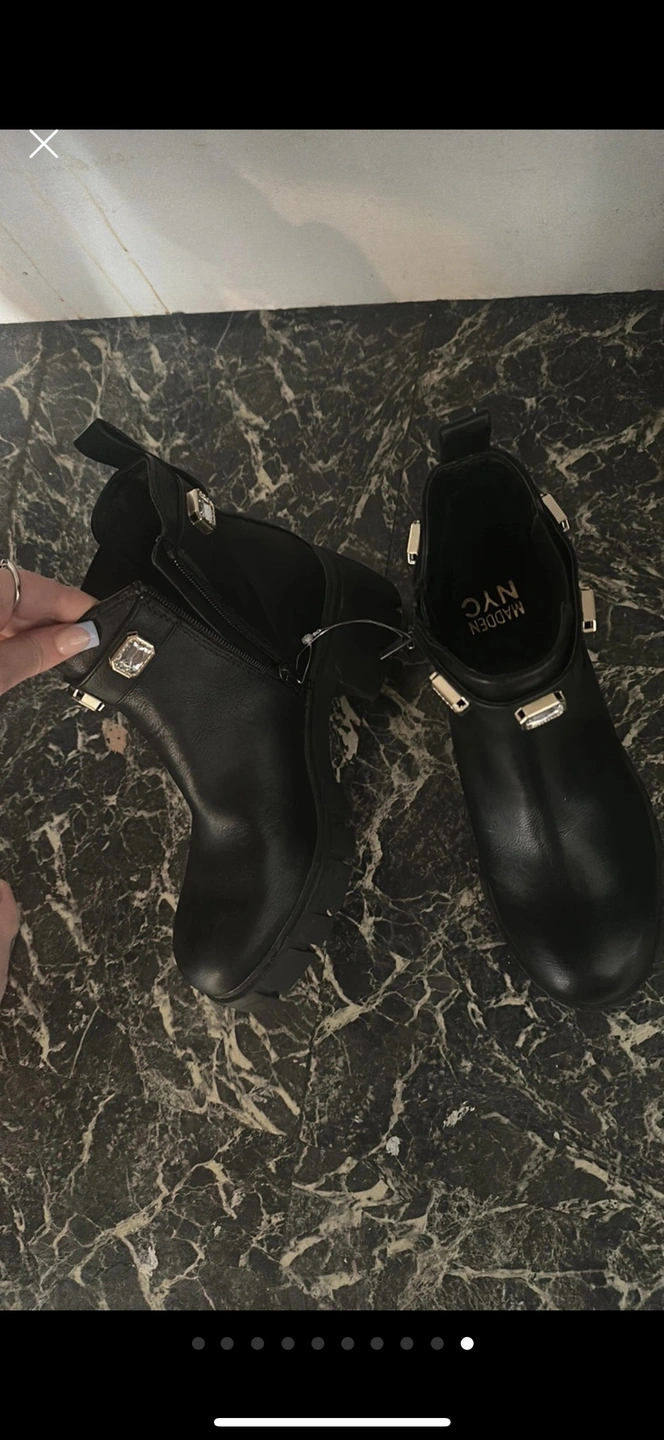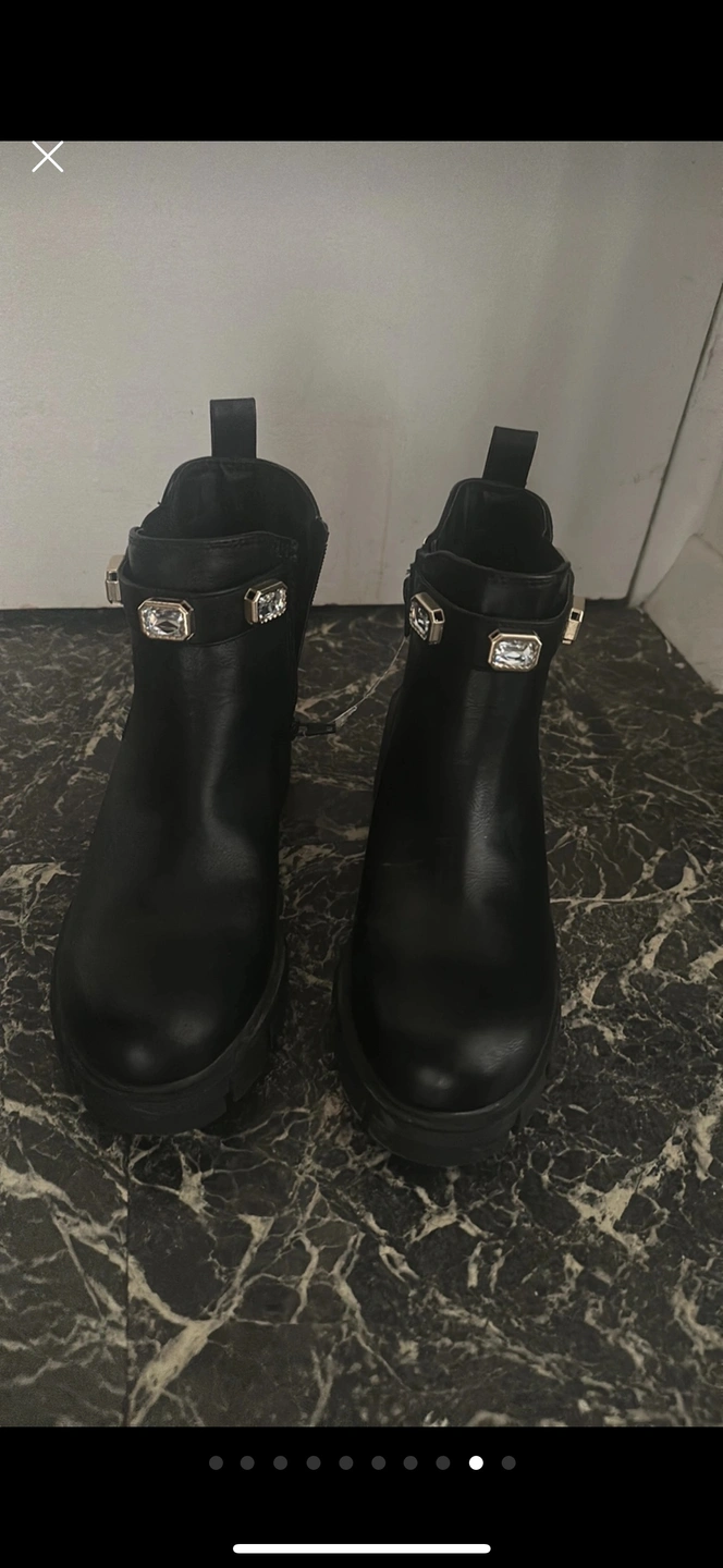 Black leather booties with a chunky heel and embellished strap. Brand new From Steve Madden, the Amulet Jewel Embellished Lug Sole Chunky Block Heel Combat Booties feature: Synthetic upper with jewel embellished band Slip-on design Pull tab at heel Synthetic lining Synthetic outsole Approx. 4.5" boot shaft height Approx. 11" boot shaft circumference Approx. 2" heel height