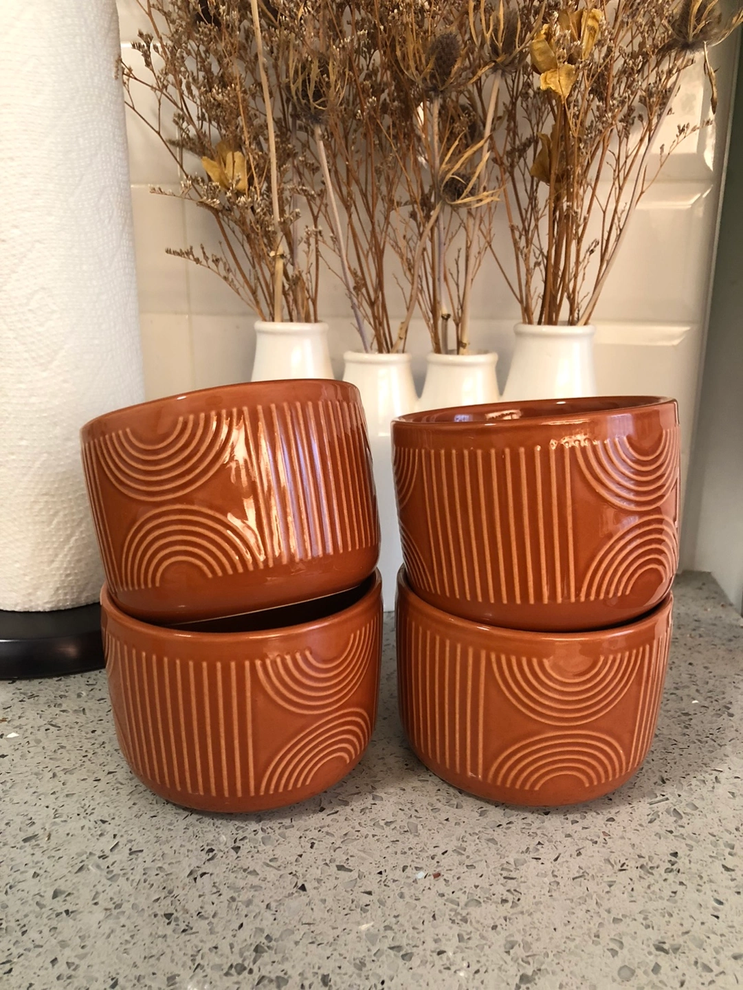 Set of four small ceramic bowls with a terracotta colour and a geometric design. The product description was “ramekins” but they’re too big for that, they’re more like small soup bowls. Approx the size of a large latte mug. Would also be cute to use as planters!