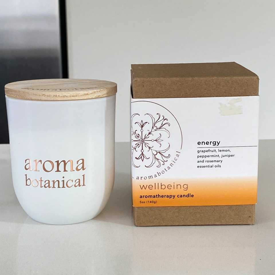 Aromatherapy candle with grapefruit, lemon, peppermint, juniper, and rosemary essential oils. 5oz. Burn time 40+ hours. Free from animal testing. High end import from the Energy collection. Blended in Australia, infused with essential oils. Helps decrease fatigue while boosting focus and energy levels. Beautiful container with wooden lid Pick up Pickering - Altona & Sheppard or Toronto - Greenwood & Gerrard