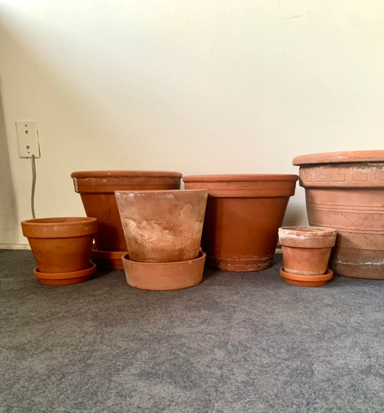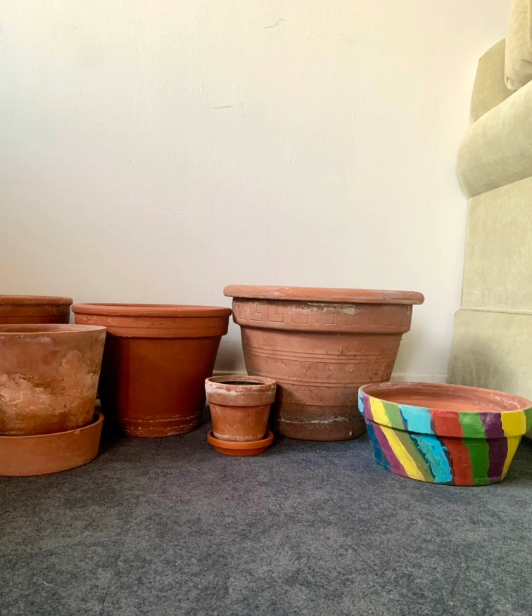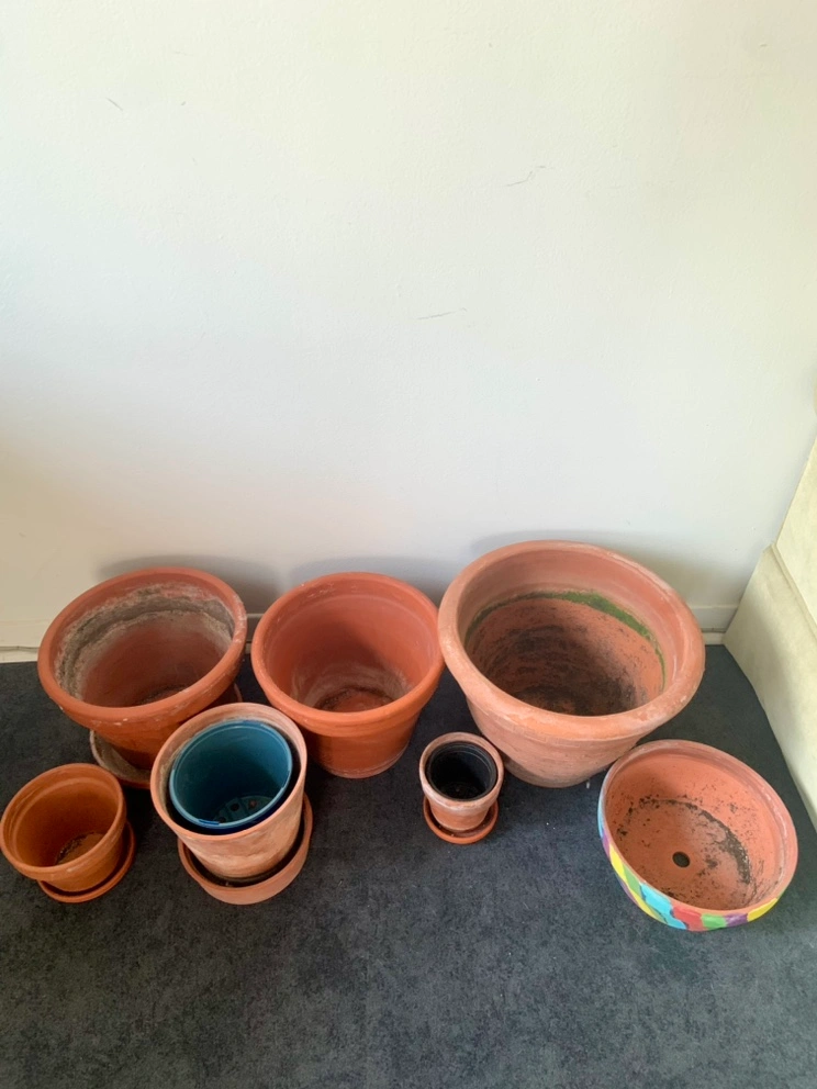 A set of 5 terracotta pots of varying sizes. Take all for 30 Please indicate day and time you would like to pick up. I will not be answering to just “hello's” ▶️Price firm ▶️serious inquiries only. ▶️Pick up only ▶️final sale. 💵cash payment with exact change.