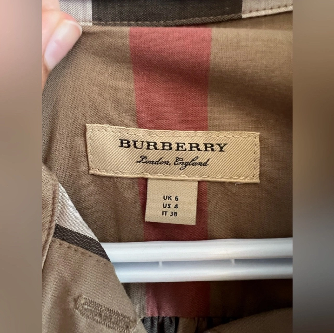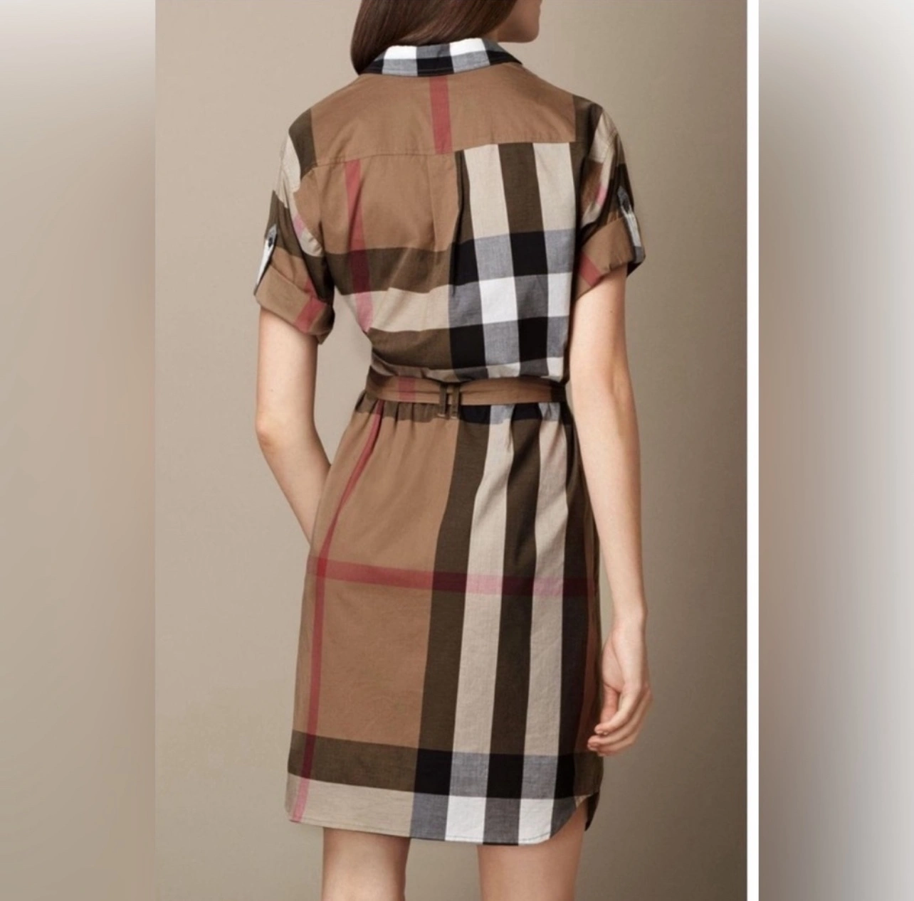 A beautiful, classic Burberry check dress. It has a collar, button down front, and a belt. The dress has 3/4 sleeves with buttoned cuffs.