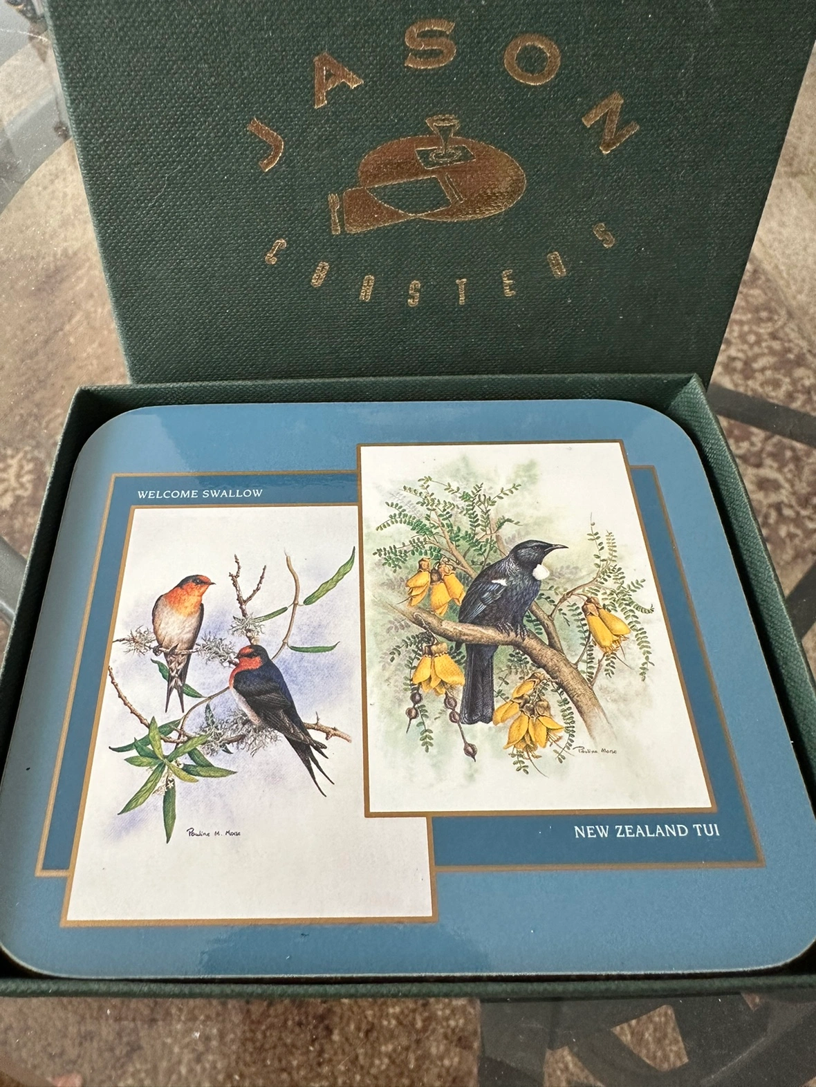 Set of six coasters featuring New Zealand birds. They are in a green box with a gold Jason Coasters label. Each coaster features a different bird, the Welcome Swallow, the New Zealand Tui, the Fiordland Crested Penguin, and the New Zealand Blue Penguin etc. brand new, smoke free home