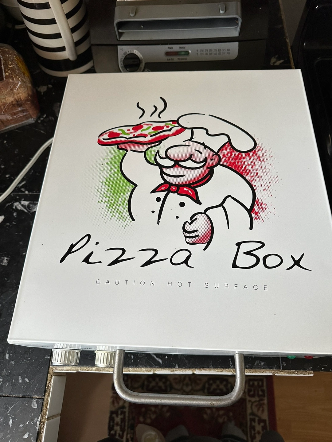A vintage Pizza Box Electric Pizza Oven. Used a couple times, includes manual and recipe booklet, smoke free home