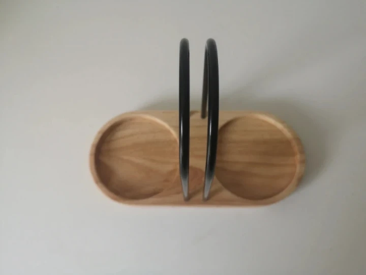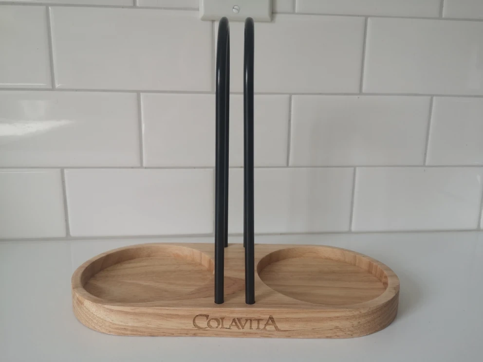 Wooden holder with metal handles for oil & vinegar.