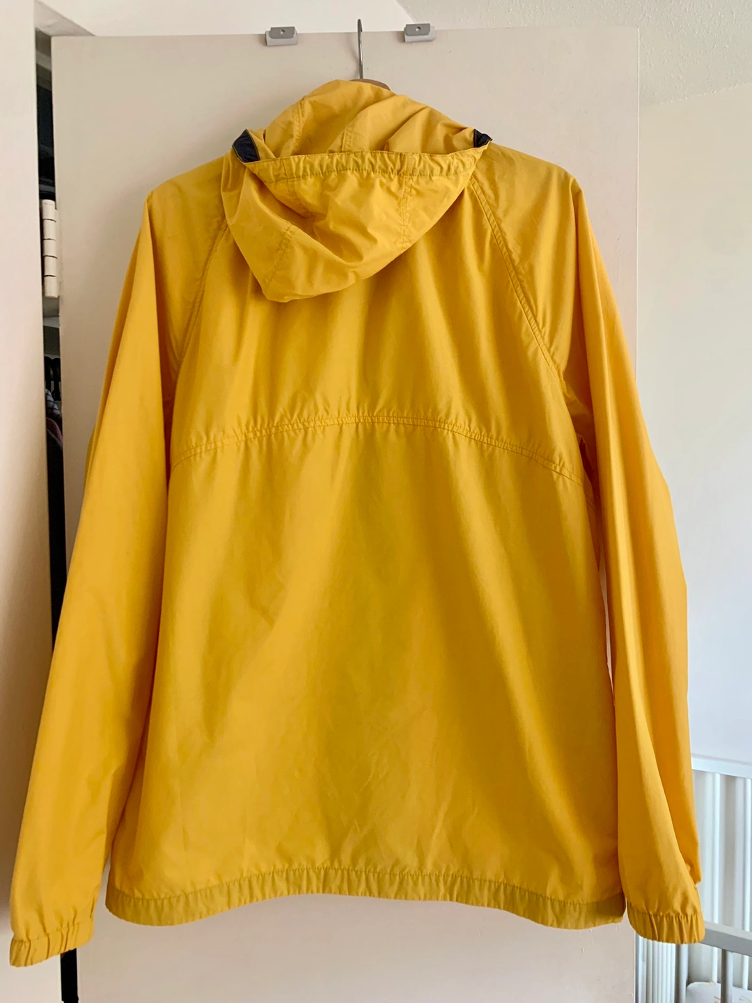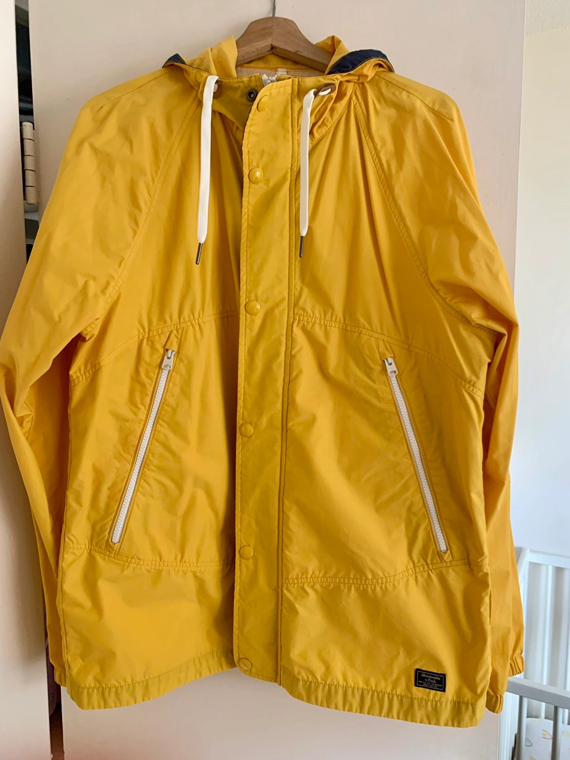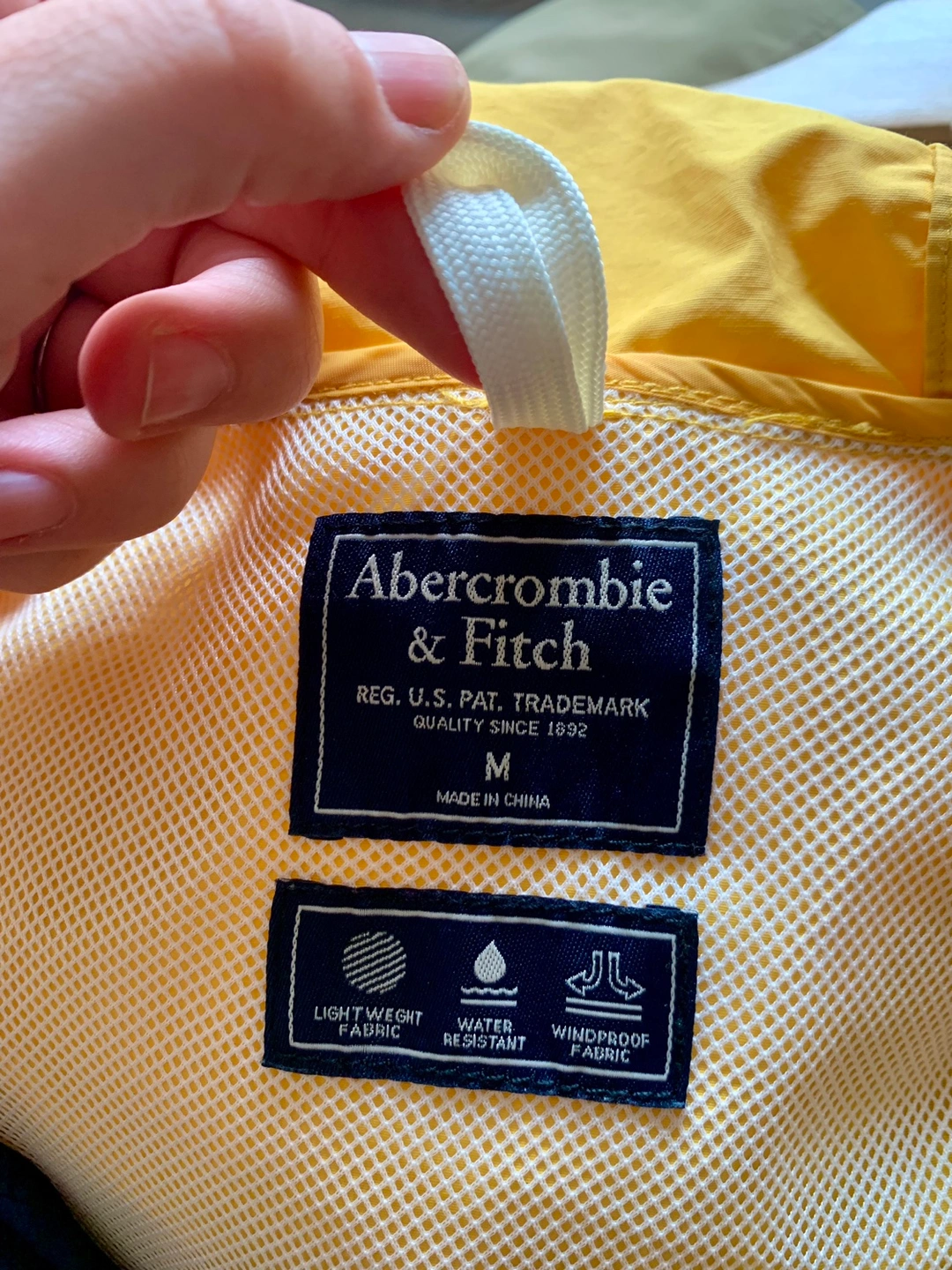 A yellow hooded rain jacket from Abercrombie & Fitch. The jacket is lightweight and has two front pockets. The hood is attached and has a drawstring. The jacket has a zipper closure and a snap button closure. It is labelled as a size medium. The label indicates the jacket is water resistant and windproof. $40 Cash or etransfer Pick up in the West End on Barclay Street (Thurlow) Check out my other listings.