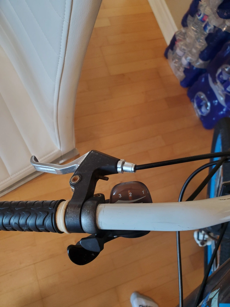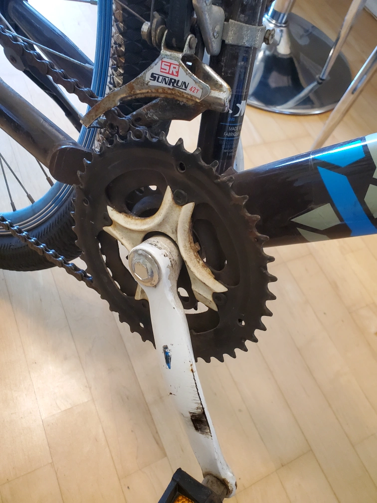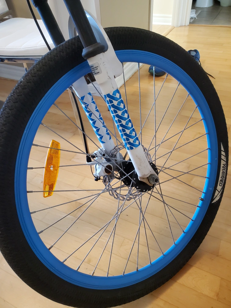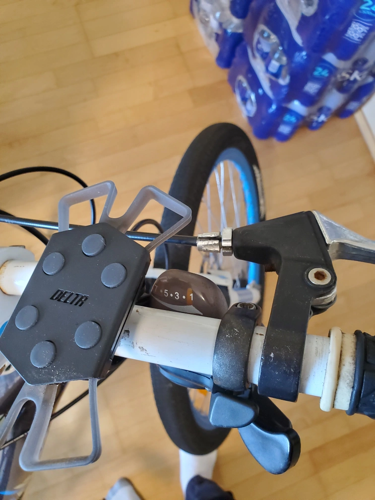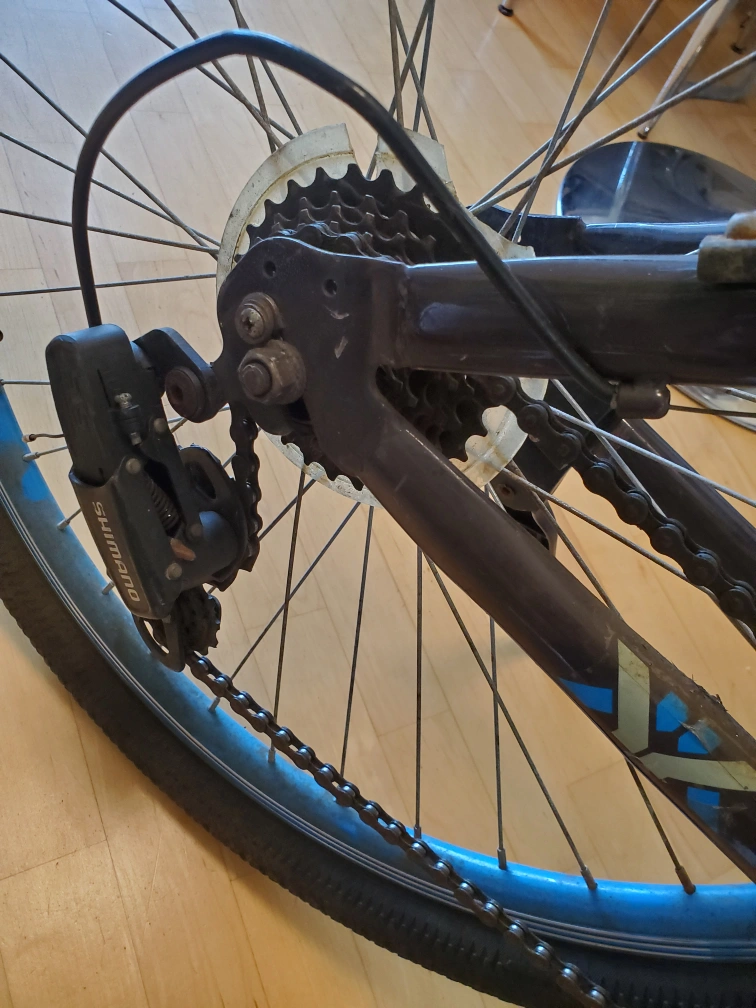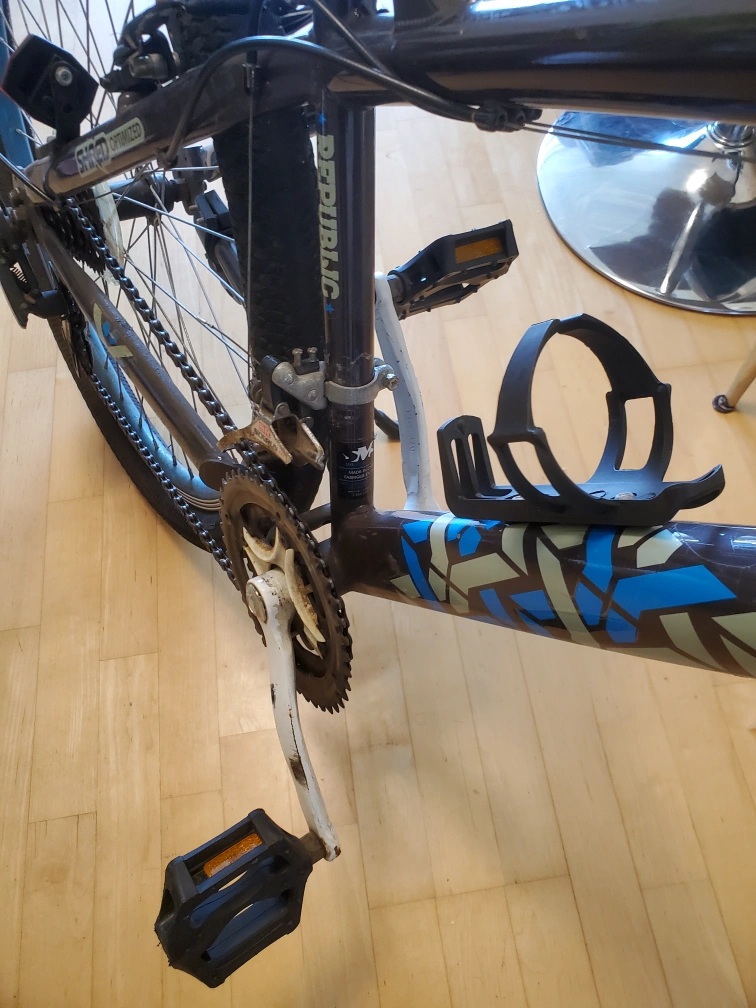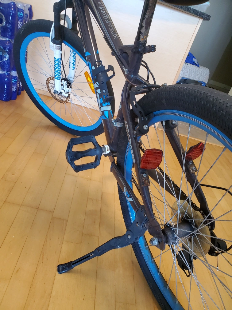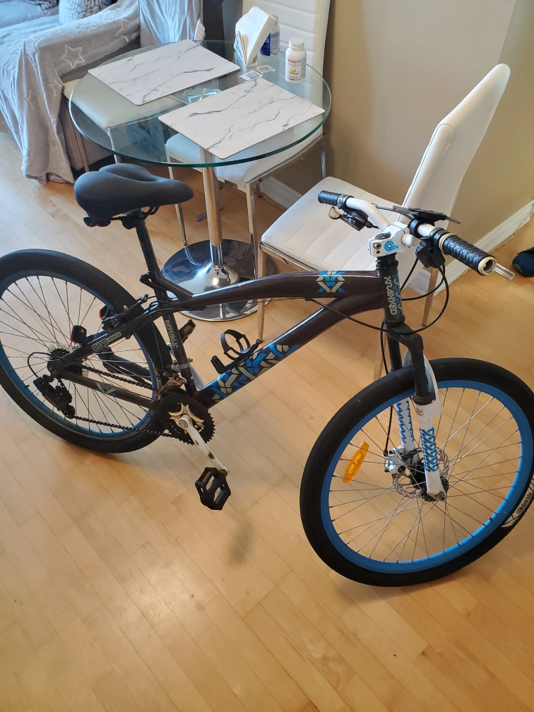 Black mountain bike with blue accents. Has a front suspension and disc brakes. Has a phone holder on the handlebars. Minor scratches, works as it should, new seat installed