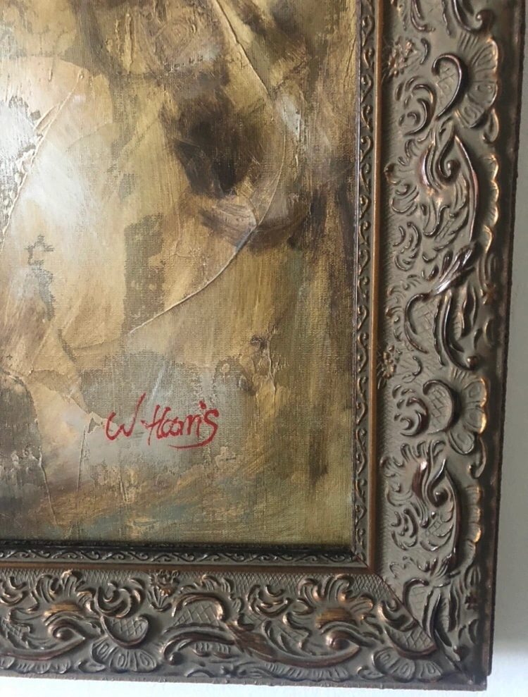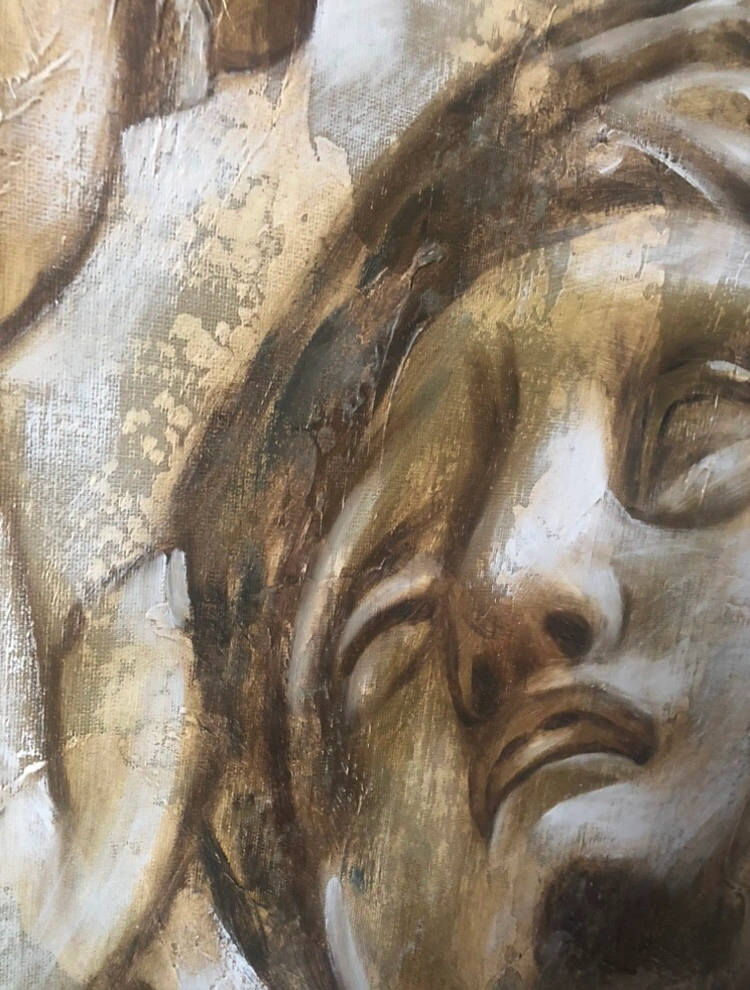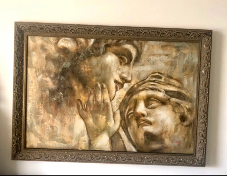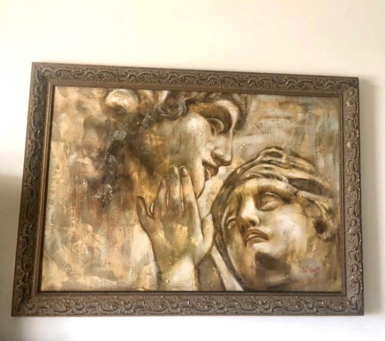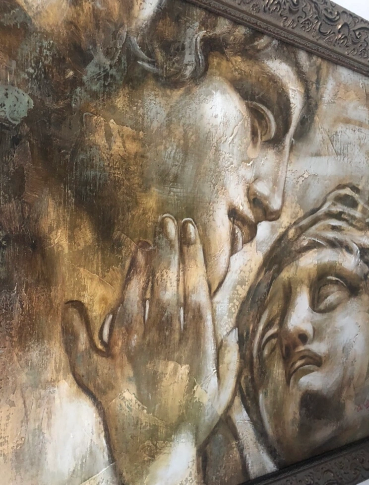 Large framed canvas painting with two figures. Framed Michelangelo Roman Greek Lovers Repro, 40”x29”