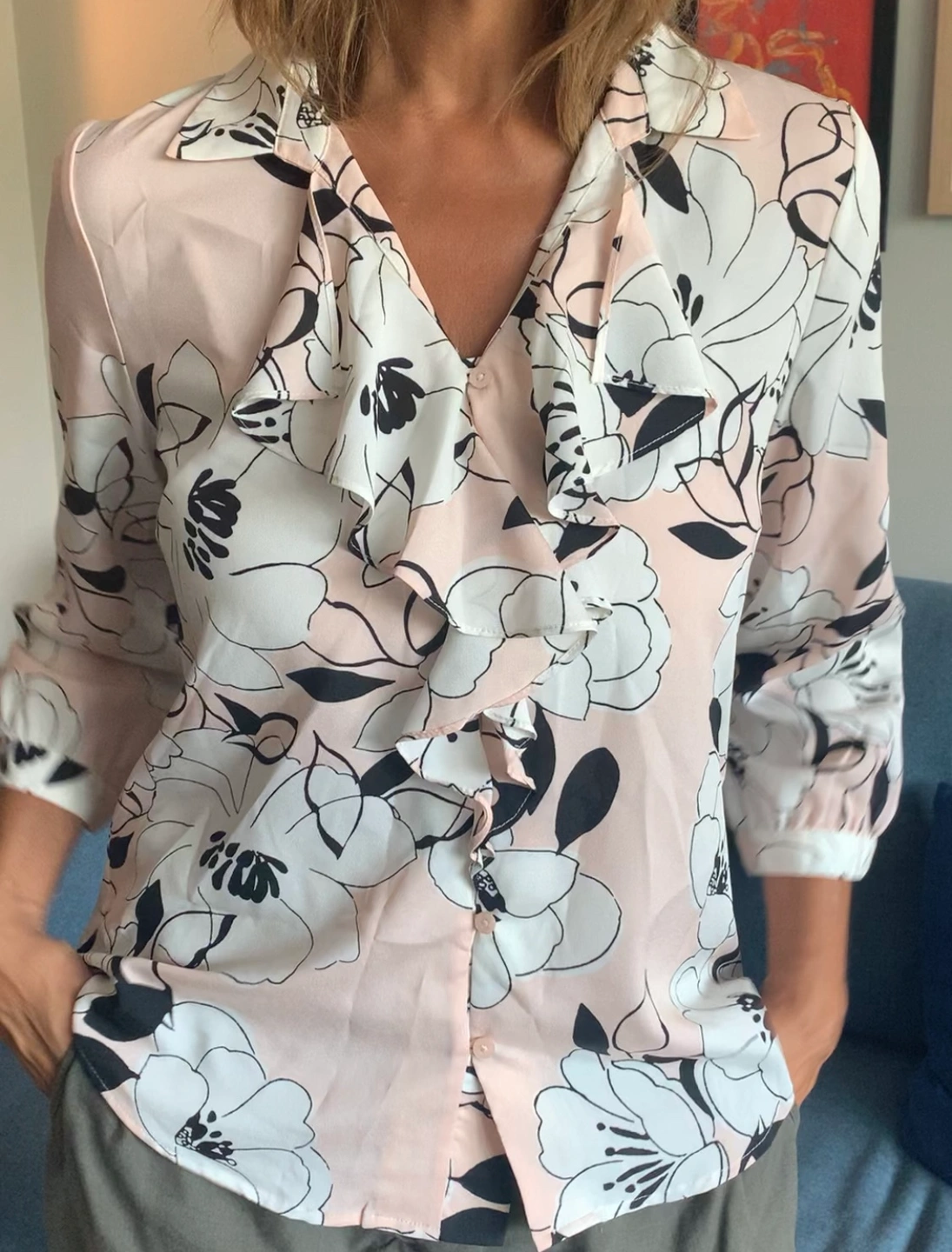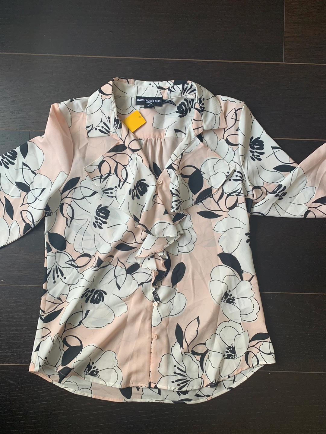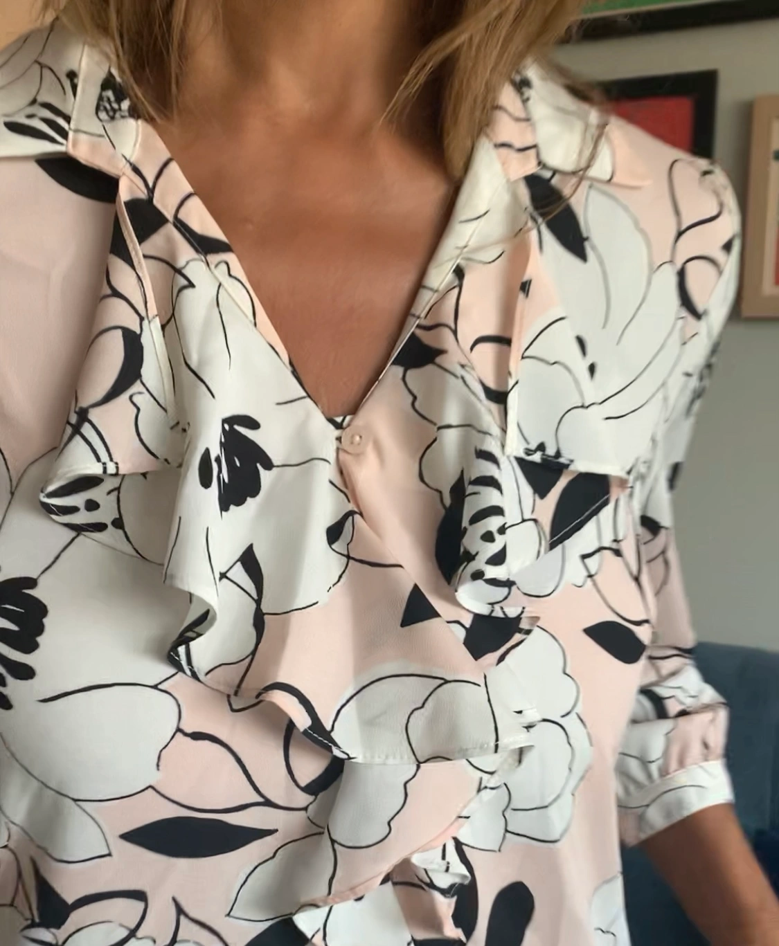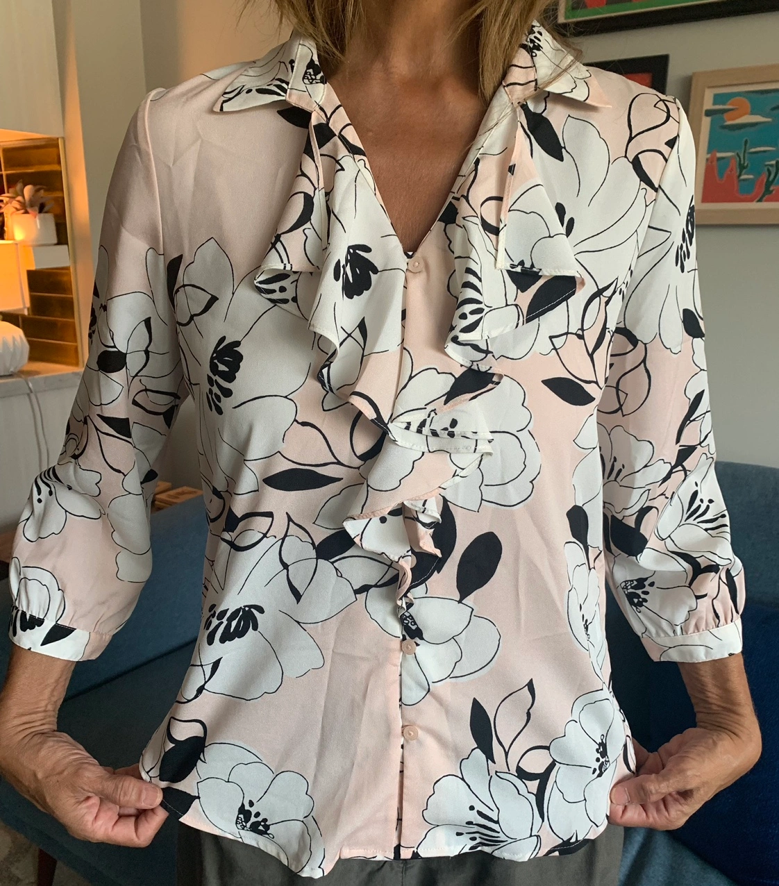 - Pink, white, and black floral pattern - Button and ruffle detail - 3/4 length sleeves - Polyester - Flowy, lightweight - No major flaws to note See photos for measurements, feel free to ask me about sizing questions and for more measurements. Happy to help! Compare measurements to a similar item you own. Model is a size SMALL 5-7 ⭐️Hello, my name is Jasmine. I recently moved to Toronto from the U.S. where I used to sell vintage and secondhand clothing. I brought my remaining stock with me, and items are priced to move. I am friendly and always happy to answer any questions - so feel free to message me! I live near the intersection of Bathurst and Eglinton. I prefer pickup, but will consider delivery if I’m in the area or at an extra cost. Open to offers!’⭐️