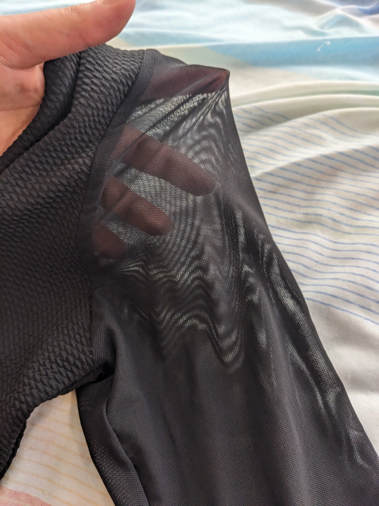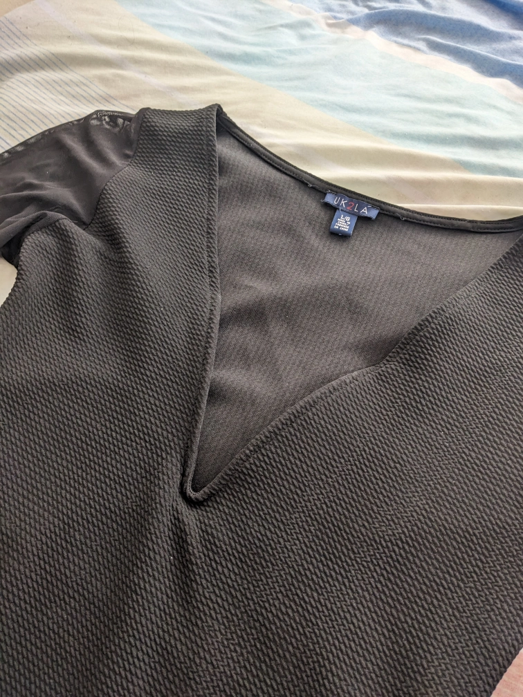 Other Details: - 95% Polyester, 5% Spandex - Mesh long sleeves - Sleeve length Approximately 2f - Metal wire for deep V-Neck line - Top of shoulder to hem approximately 33"