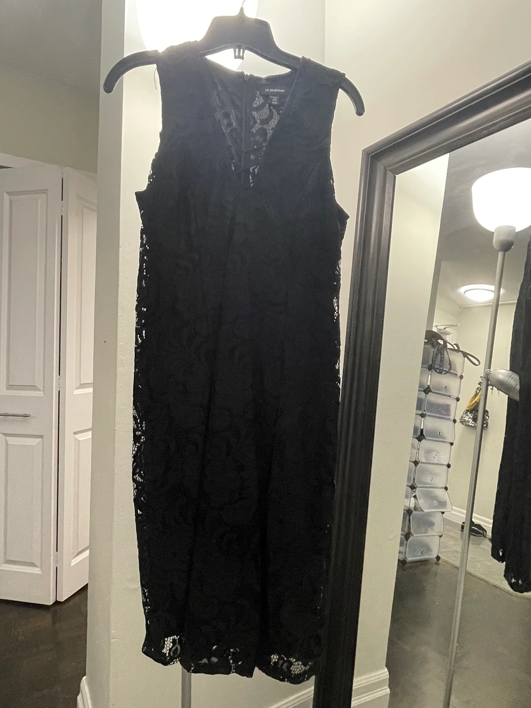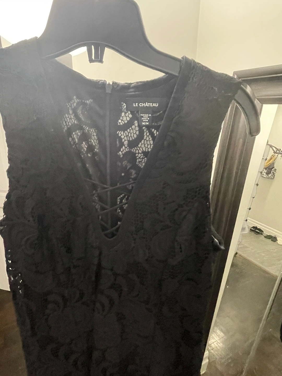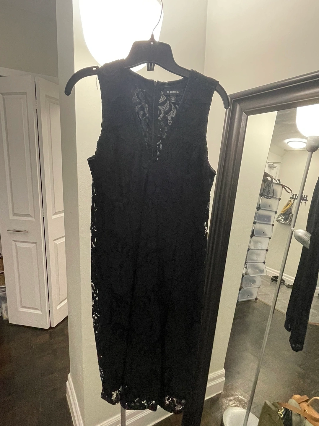 Elegant Black lace dress with a V-neck and a fitted silhouette. Only used once. Bought at le chateau for $109 + tax.
