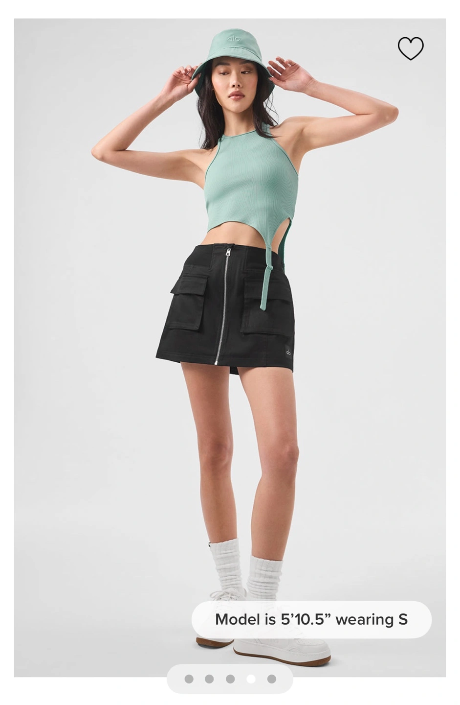 A mint green ribbed tank top with a unique cut out design. It has a scoop neck and racerback. The tank is cropped and has a tie detail on the side. New, never worn sold out in stores Botanical green