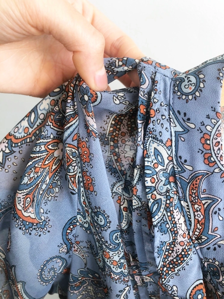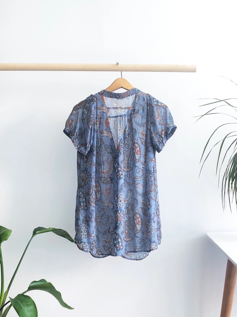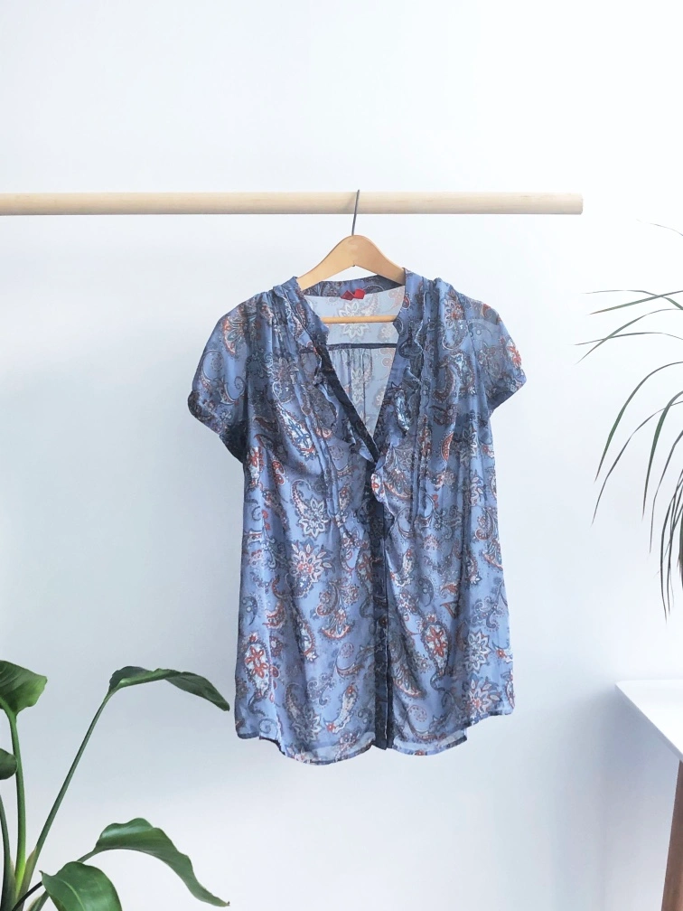 Blue flowy blouse, with paisley print with hints of burnt orange or terracotta. Loved the detail in this top, the print, the neckline, the frills. Tuck it into some dress pants for a business or casual look. I loved this top so much when I saw it, I bought it even though it’s tag is XXL. Had it temporarily altered at the shoulders so it’d fit on me, as a small. But if you are XXL, I can easily snipe the stitch before meeting up. See photos! Tag: XXL or S Condition: Excellent condition, no holes, no pilling, no stains, no tears. ⭐️ Bundle with other things on my profile for discounts. 📍 Spadina/Bloor, crossposted on other platforms. #spring #summer #blue #terracotta #blouse #paisley #fall #clothes #wardrobe #closet #outfit #casual #pattern #print #frill #contemporary #minimalism #fashion #clothing #work #business #vneck #v-neck #frilly