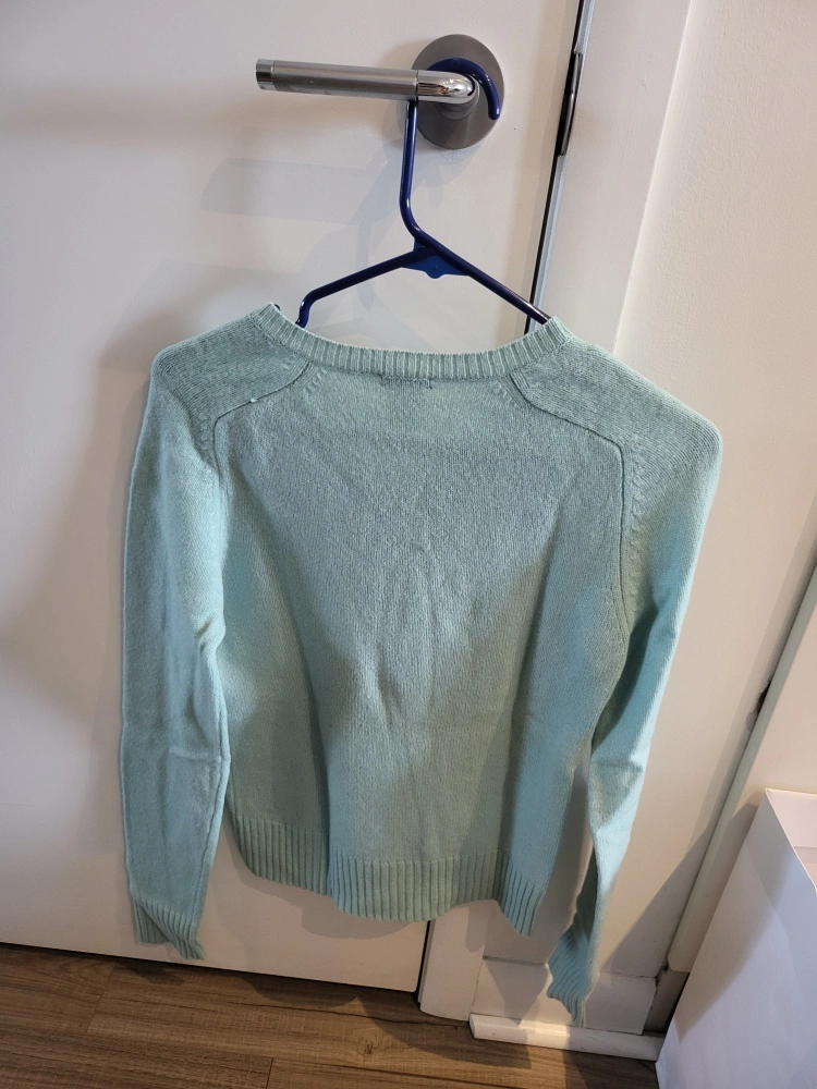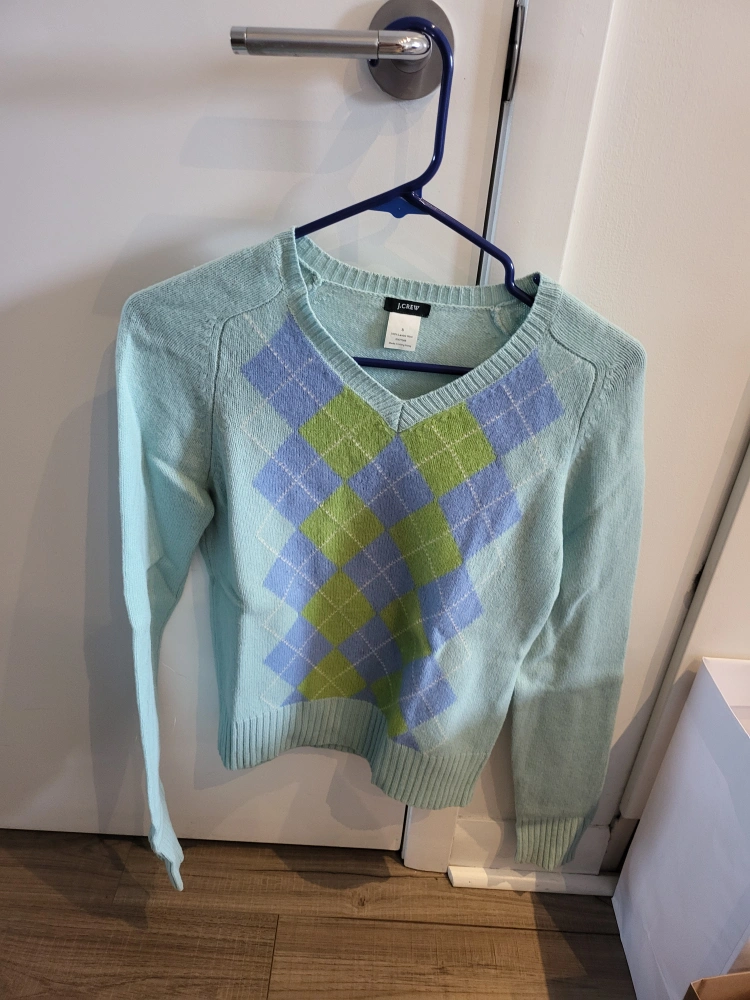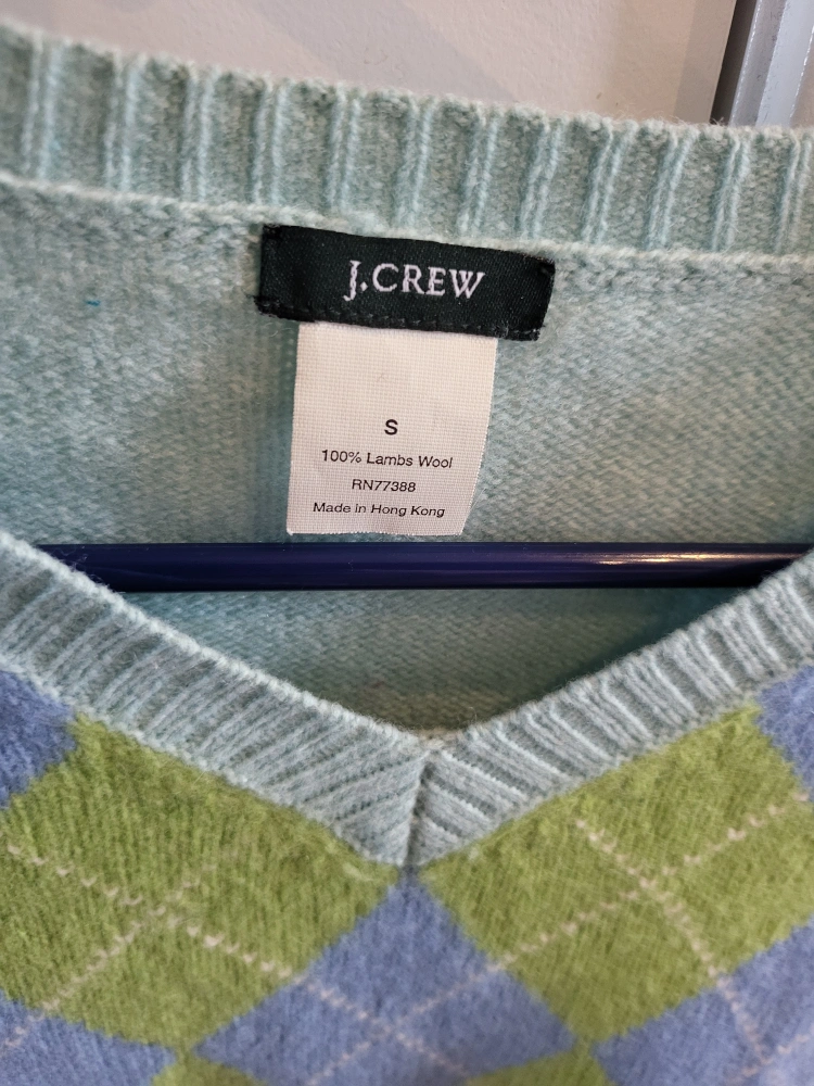 Size small, 100% lambs wool, blue, green, and white argyle pattern, made in Hong Kong.