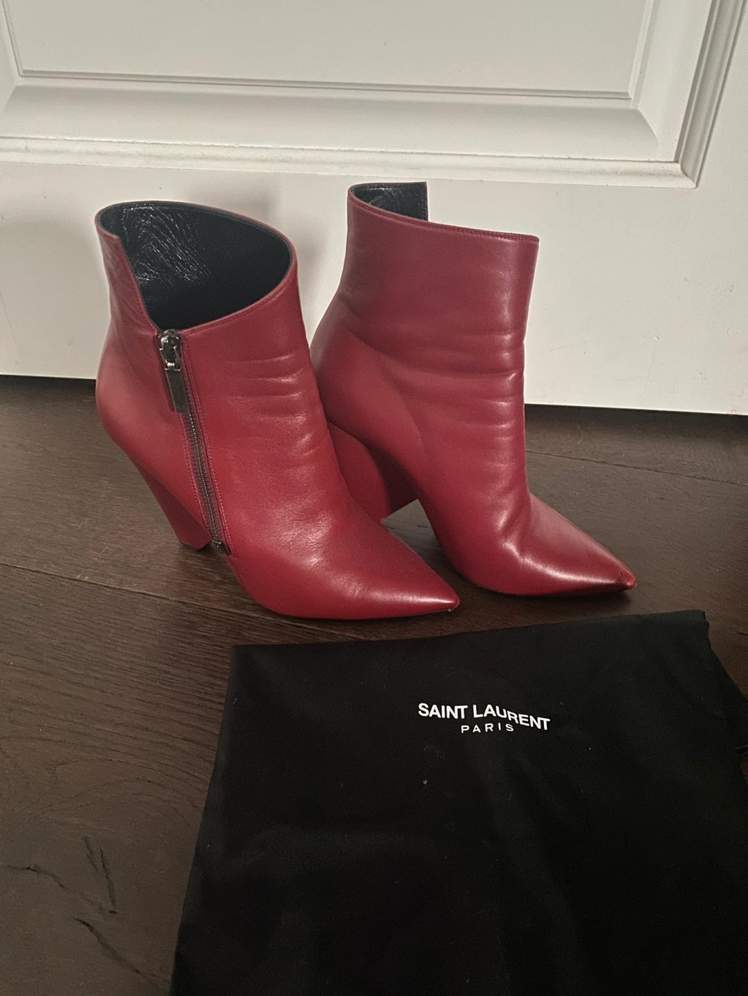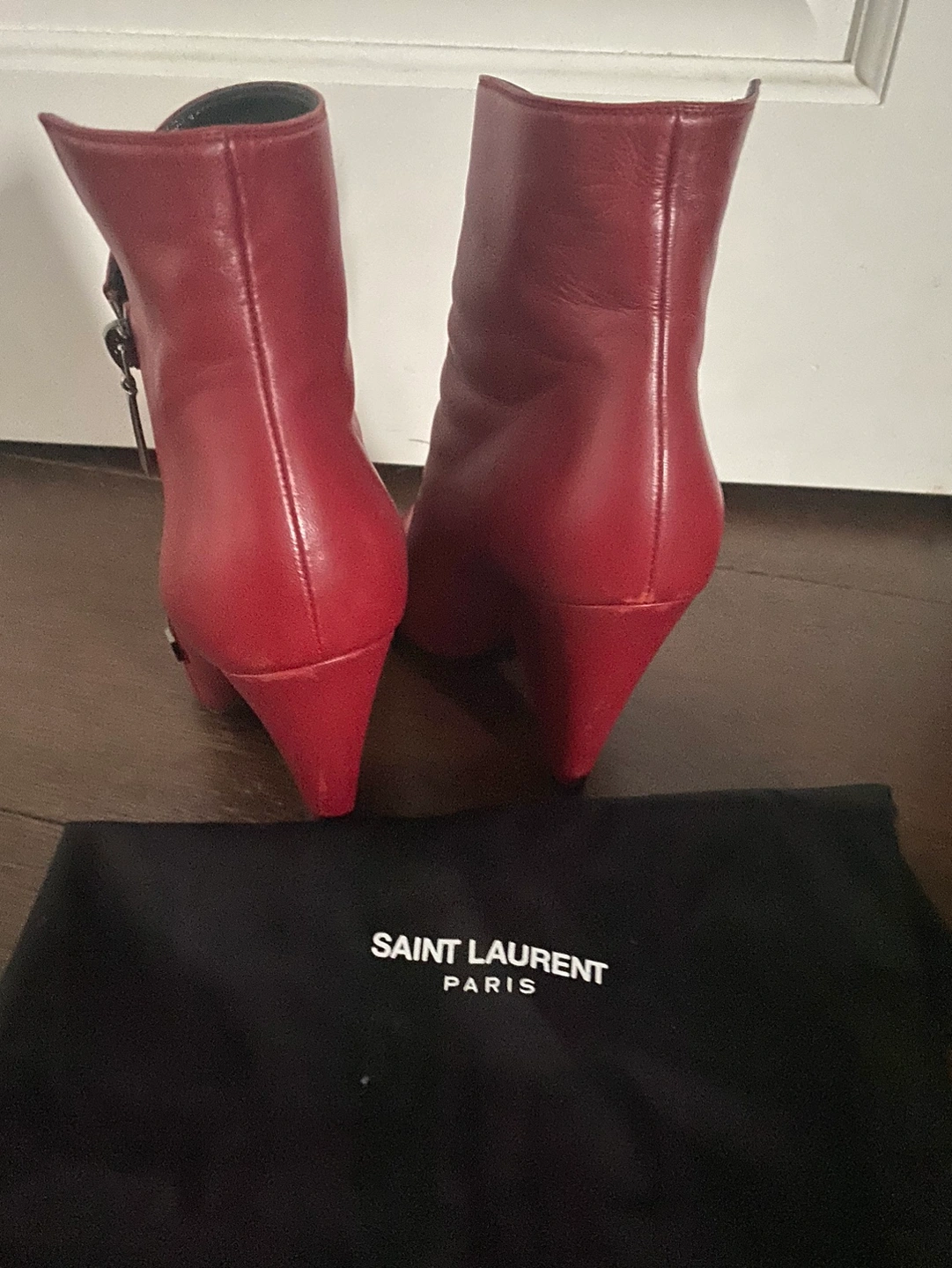 Red leather ankle boots from Saint Laurent with a pointed toe and a block heel. I believe these are called the “Niki”These are a size 38, which will fit a 7-7.5 women’s. They have only been worn twice and are in excellent condition aside from a tiny scuff on one toe. Amazing boots, only selling because I don’t wear red much and thought someone else might give them the love they deserve!