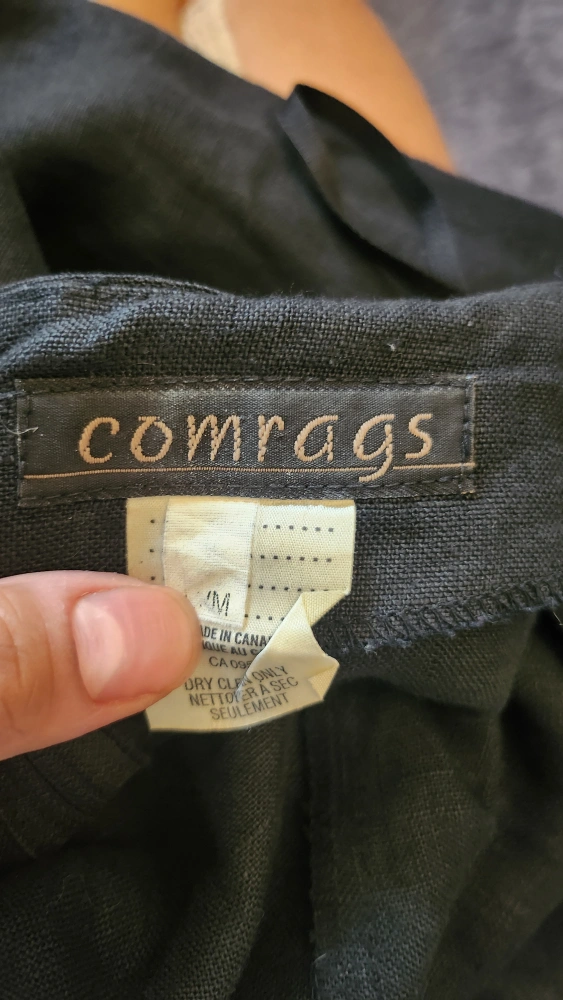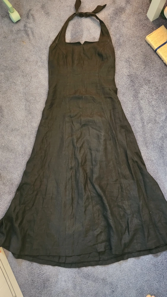 Black linen halter dress with a fitted bodice and a flowy skirt. The dress has a sweetheart neckline and a tie at the back of the neck.