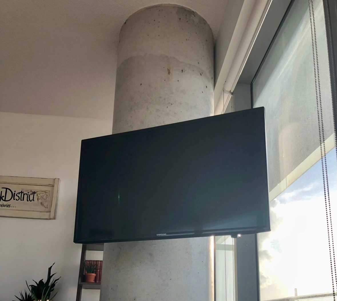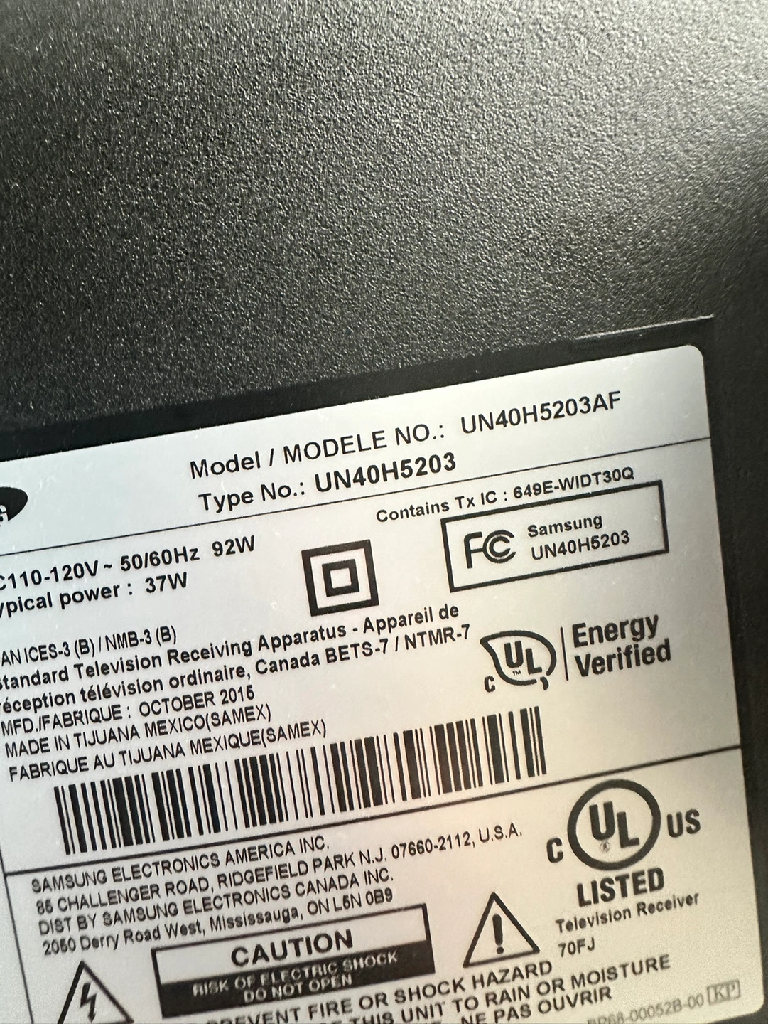 No one pays for 4k content, so this is all you need, with excellent calibration, brightness, viewing angles, and unbeatable price to picture quality. This is a value-packed 40-incher. The UN40H5203 delivers a crisp, detailed picture that gives you an ultra-clear view for movies, sports, and games. Its LED backlight combines snappy picture contrast with miserly power usage. The thin black bezel framing the screen gives this set an elegant, classy look. Excellent viewing angles, great overall picture quality, with deep blacks, and low input lag. Product highlights: 40" screen (measured diagonally) glossy screen, black bezel and cabinet tuner receives over-the-air HDTV broadcasts (antenna required) QAM cable TV tuner (subscription required to receive cable channels — contact your local service provider for details) direct-lit LED backlight for high picture contrast 60Hz refresh rate plus backlight scanning for blur reduction Internet-ready Smart TV — plays streamed video and more (subscription required for some services) supports up to 5.1-channel audio with streaming movie services like Vudu™ (audio quality depends on your connection speed) built-in Wi-Fi® to link to a wireless network screen mirroring — send content wirelessly from a compatible smartphone or tablet to the TV built-in stereo speakers (10 watts x 2) remote control Anynet+ simplifies control of compatible Samsung components via the HDMI connection (HDMI-CEC) meets ENERGY STAR® requirements Connections and Dimensions: 3 A/V inputs, including: 2 HDMI 1 component video (selectable component/composite) RF input for antenna/cable signals optical digital audio output (may only pass 2-channel audio from HDMI-connected sources) stereo minijack output for connecting a sound bar or home stereo system 2 USB inputs for connecting a camera or thumb drive no stand wall-mountable (bracket not included) 36-9/16"W x 21-5/8"H x 3-11/16"D (200x200 on VESA mount/adapater) weight: 18.9 lbs Pick up in Distillery/Canary District/Corktown/Esplanade/St. Lawrence Market