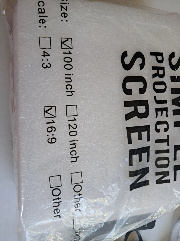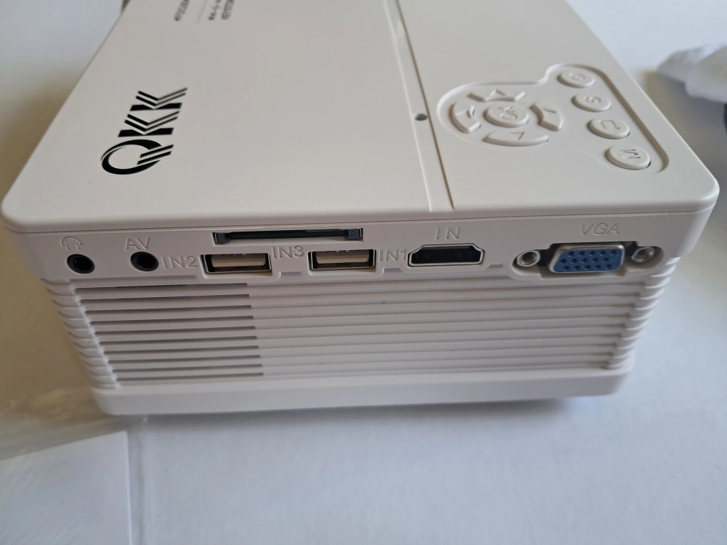 A projector with a remote control, a screen, and a power cord. It also has a variety of connection options.