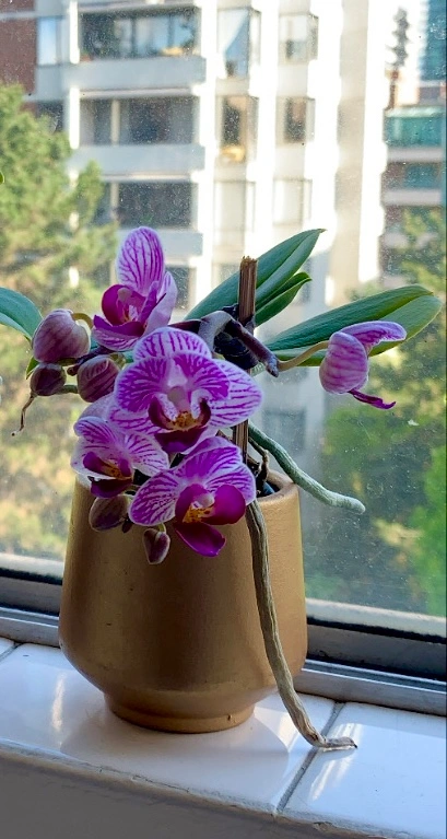 Orchid plant in a gold ceramic pot with new growth and blooms (not currently blooming, but does so about three/four times a year - photo for reference). A beautiful addition to your home! $10 Cash or etransfer Pick up in the West End on Barclay Street (Thurlow) Check out my other listings.