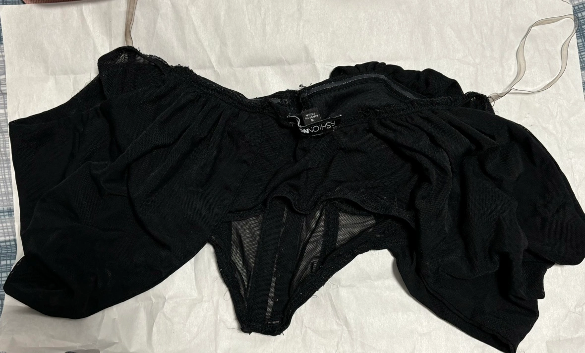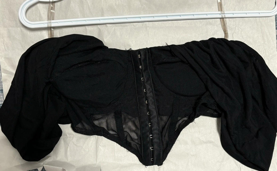 This is a black mesh corset top with puff sleeves. It has a hook and eye closure in the front. The top is made of a sheer mesh fabric and has a stretchy fit. It is in an okay condition. Worn for 5-6 times PICK UP ONLY
