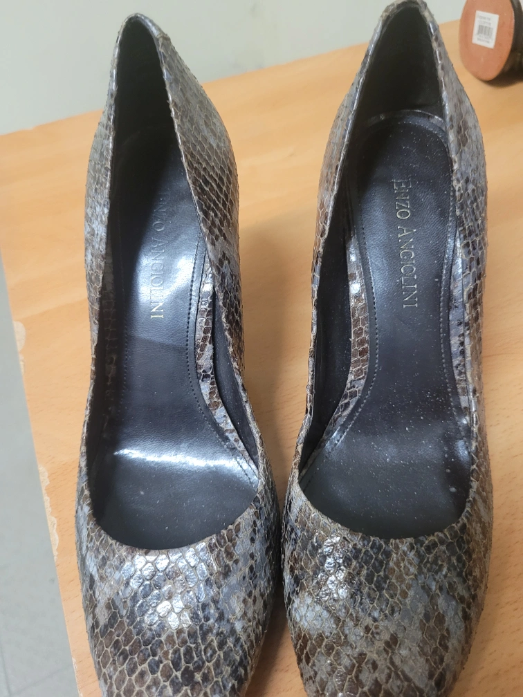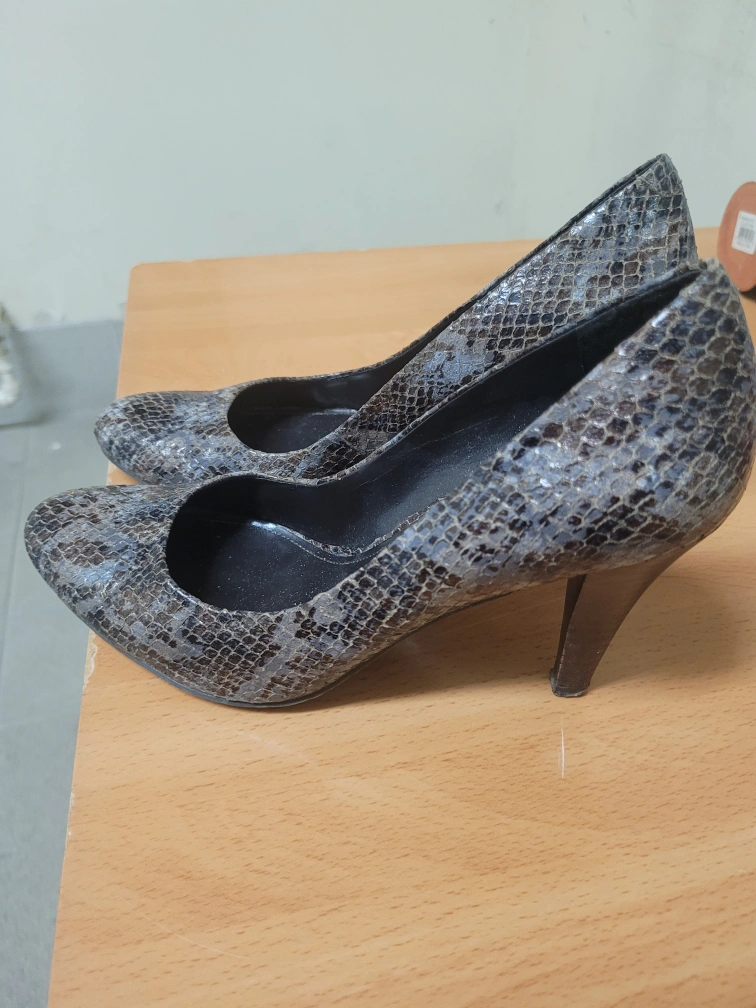 These are a pair of stylish, snakeskin-patterned heels.