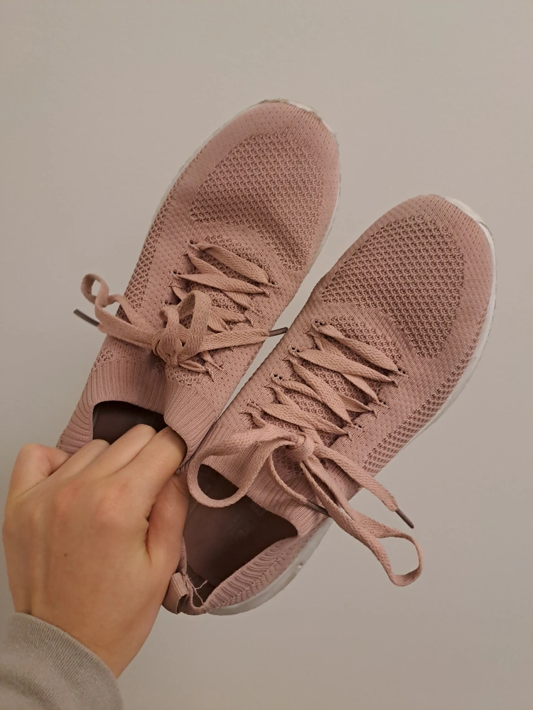 These shoes are a light pink colour with a knit upper. They have white soles and laces. Giving them away because I'm moving and can't take them with me.