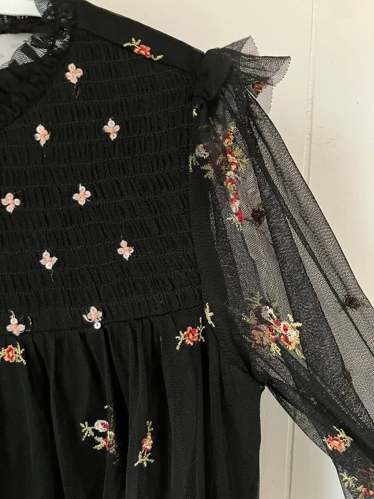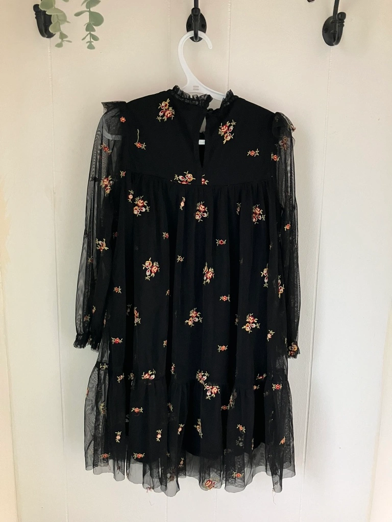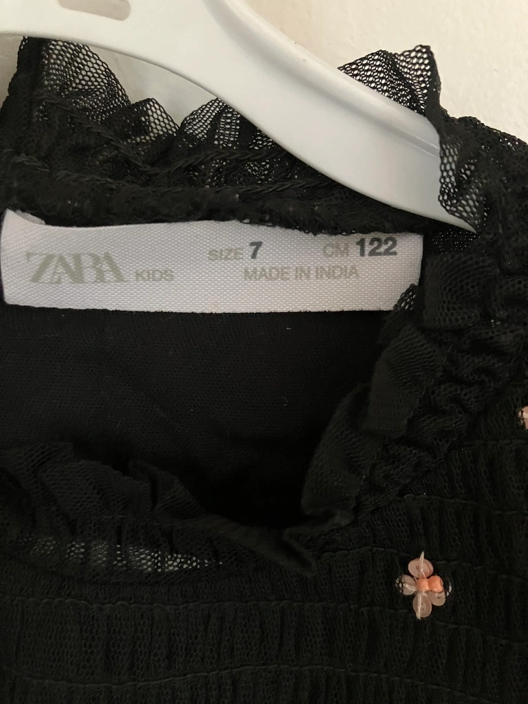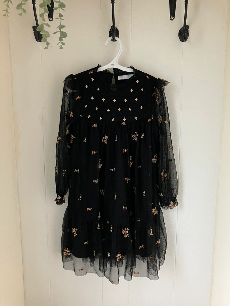 In gently used condition! Wore to a wedding. Brand Zara Size 7 Colour Black Gorgeous dress for a little girl on a special night. Flowy floral dress perfect for cooler evenings or special occasions or holidays. Dress has an outer layer of black tulle with stitched on flowers. Top chest part has some stretch and smaller stitched flowers for a beautiful contrast. Underneath is a soft black material layer. Bottom tulle is loose and flowy hanging around knee length. Dress closure is at the back with 1 button. Sleeves are full length and a see-through material to match the dainty florals. Sleeves tighten at the wrists with a gentle elastic. Classic black colour with a hint of colour. EASY PORCH PICKUP AVAILABLE