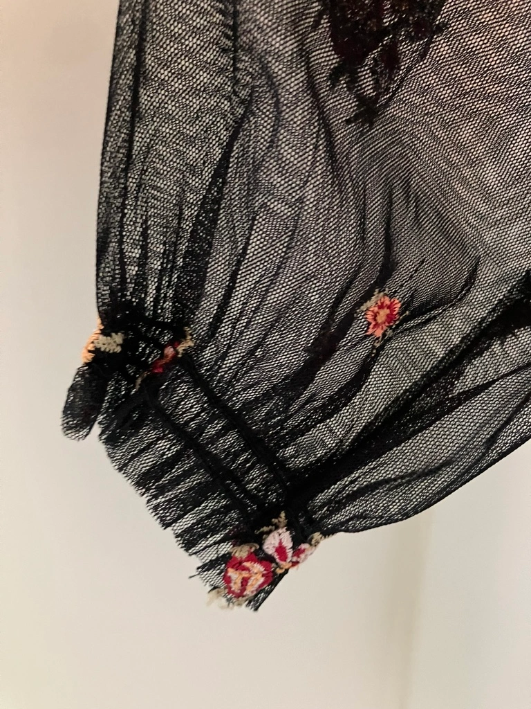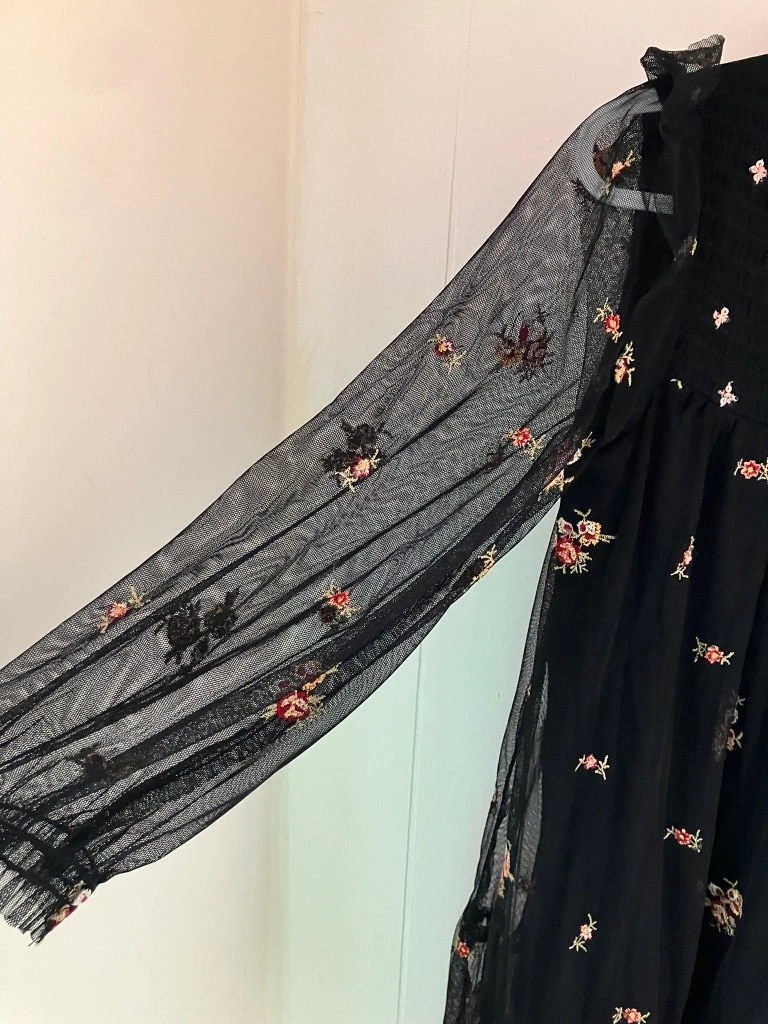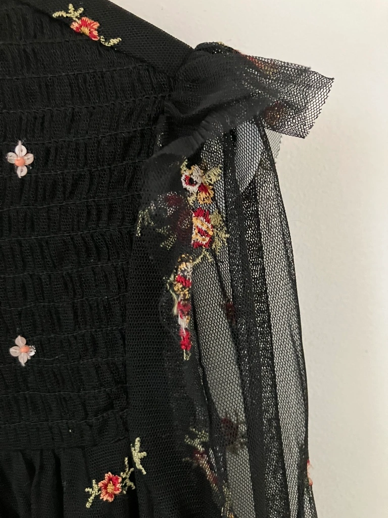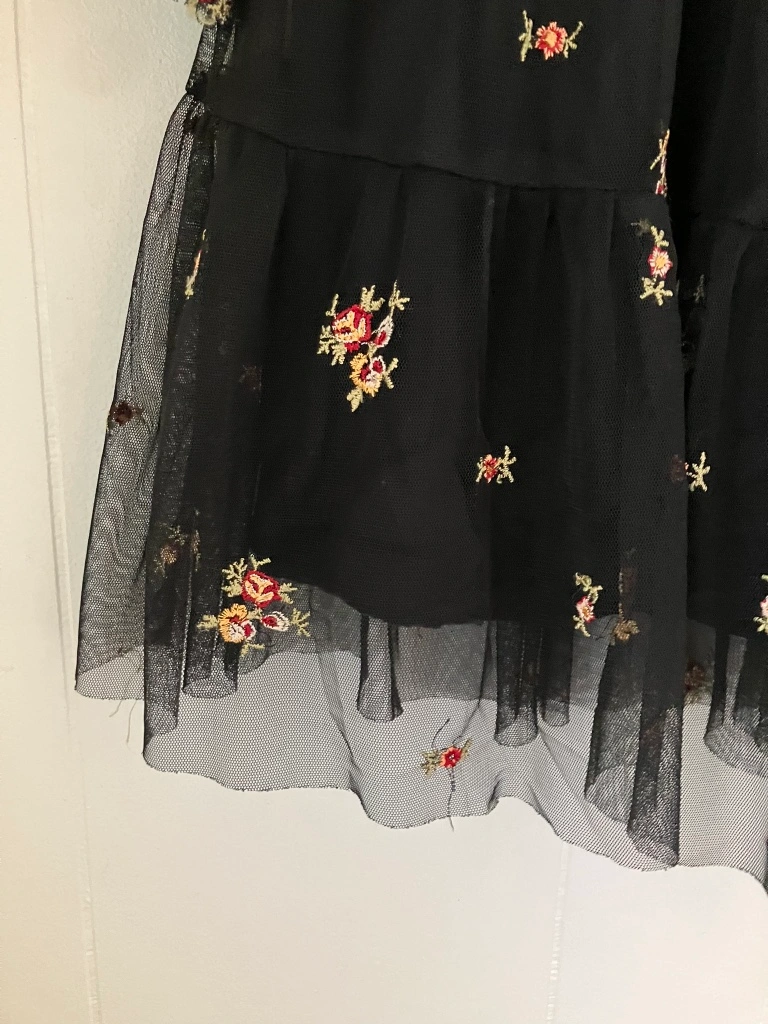 In gently used condition! Wore to a wedding. Brand Zara Size 7 Colour Black Gorgeous dress for a little girl on a special night. Flowy floral dress perfect for cooler evenings or special occasions or holidays. Dress has an outer layer of black tulle with stitched on flowers. Top chest part has some stretch and smaller stitched flowers for a beautiful contrast. Underneath is a soft black material layer. Bottom tulle is loose and flowy hanging around knee length. Dress closure is at the back with 1 button. Sleeves are full length and a see-through material to match the dainty florals. Sleeves tighten at the wrists with a gentle elastic. Classic black colour with a hint of colour. EASY PORCH PICKUP AVAILABLE