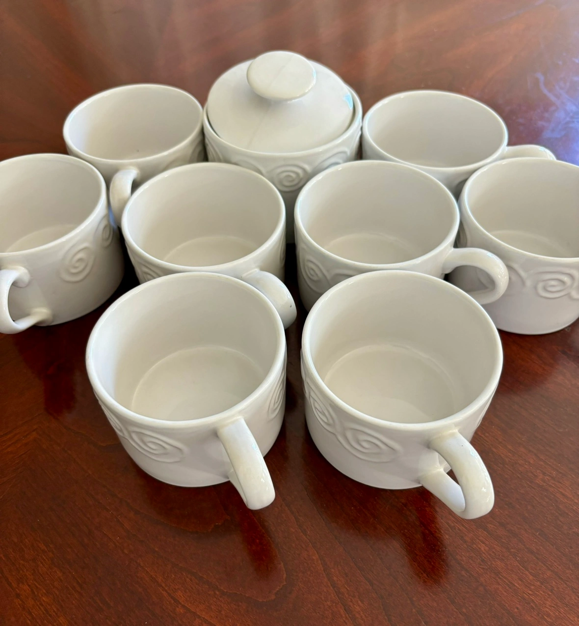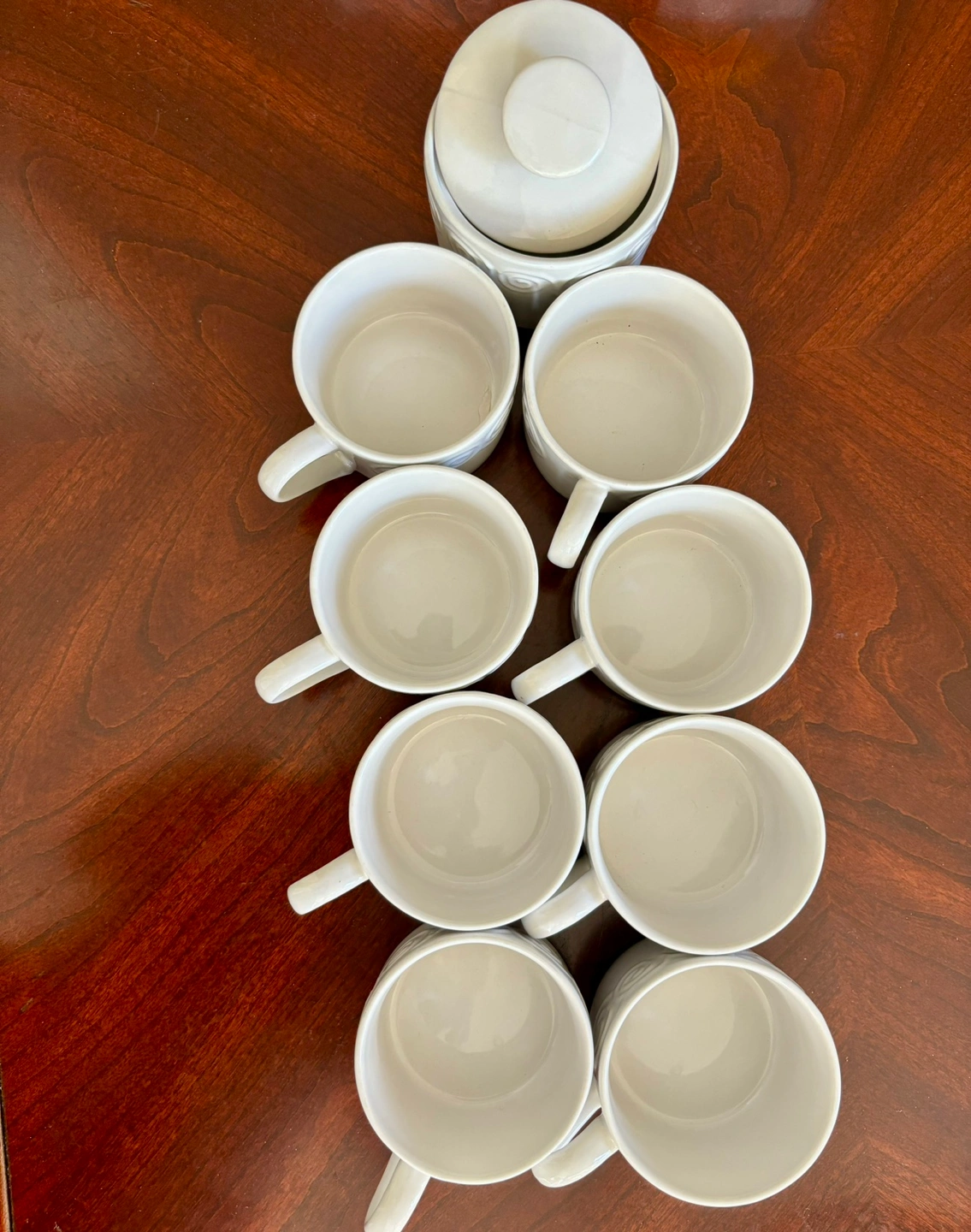 Set of 8 ceramic coffee/soup mugs with a lidded container. Each cup 8.5cm diameter 6cm tall. Oven, microwave and dishwasher safe. From parents collection and never used. A solid carrying bag is included. Click on my name for my other listings and pickup locations.
