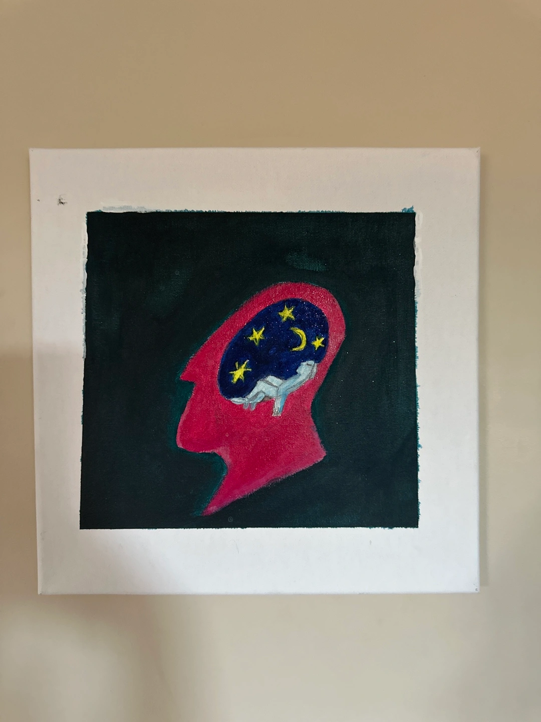 A painting depicting a head in silhouette with a night sky inside. A crescent moon and stars are painted inside the head. This is a great piece of art for a bedroom or living room.