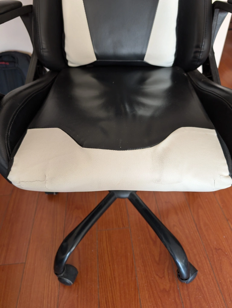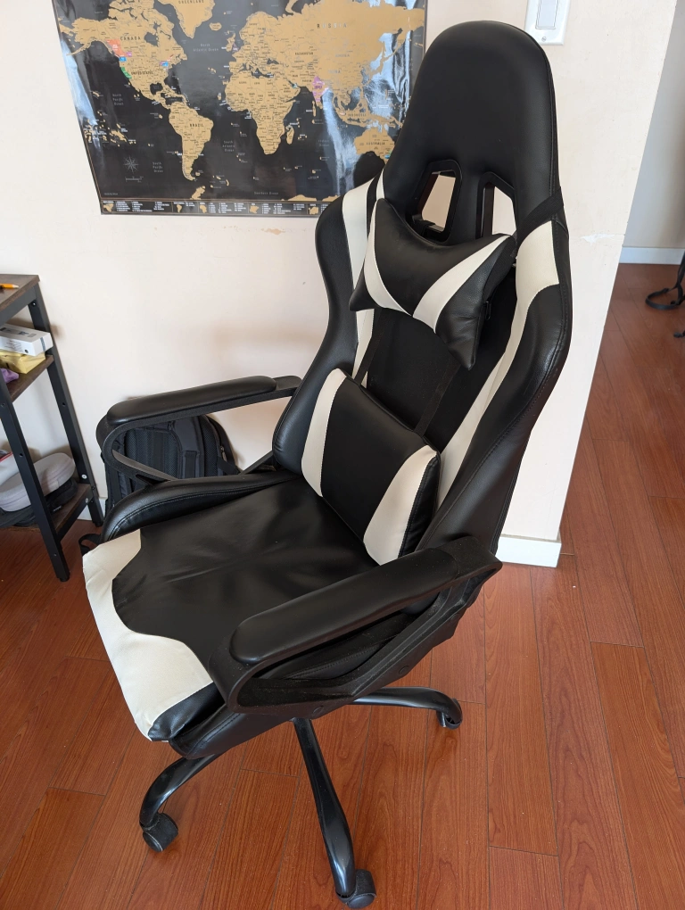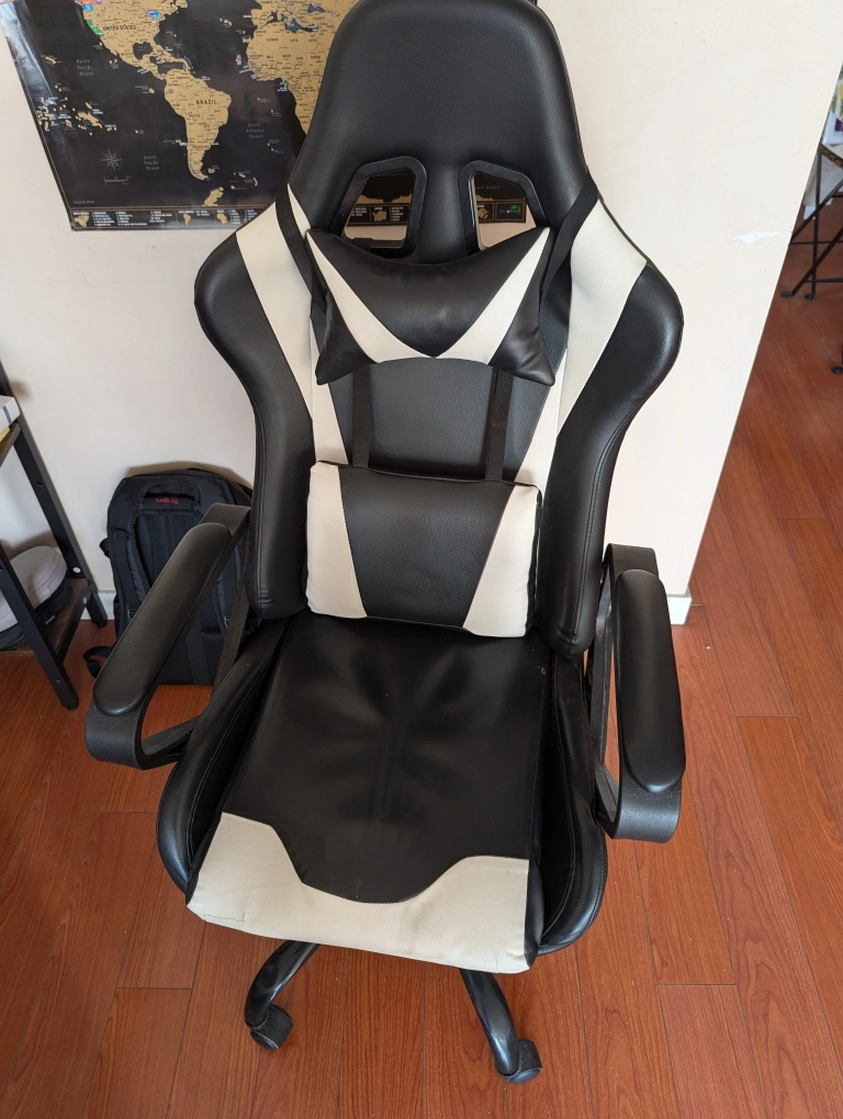 Black and white gaming chair with lumbar support pillow and headrest. The chair swivels and has adjustable height. It has casters for mobility. The chair is in good condition.