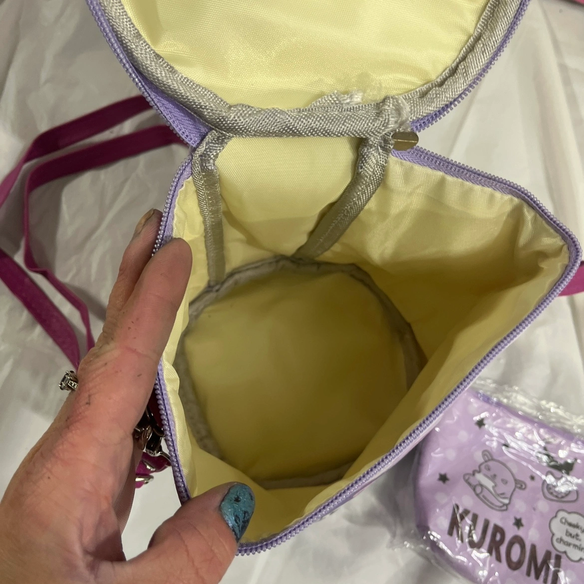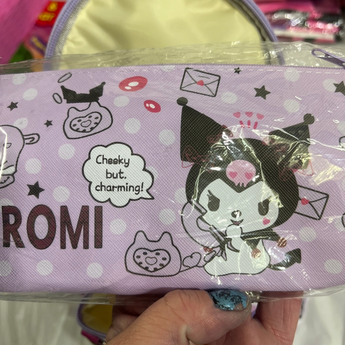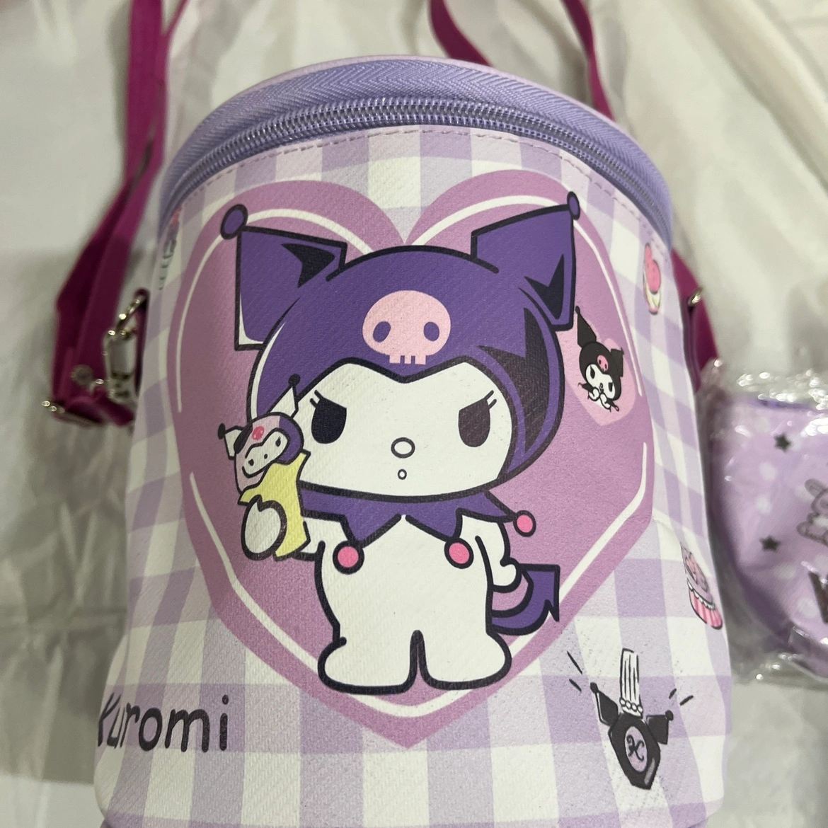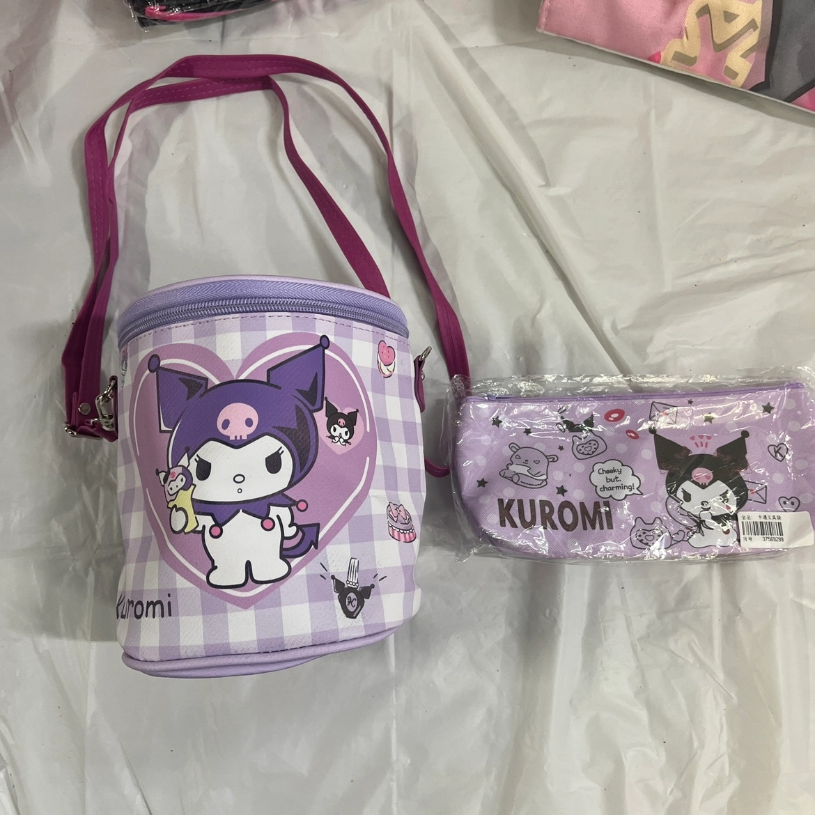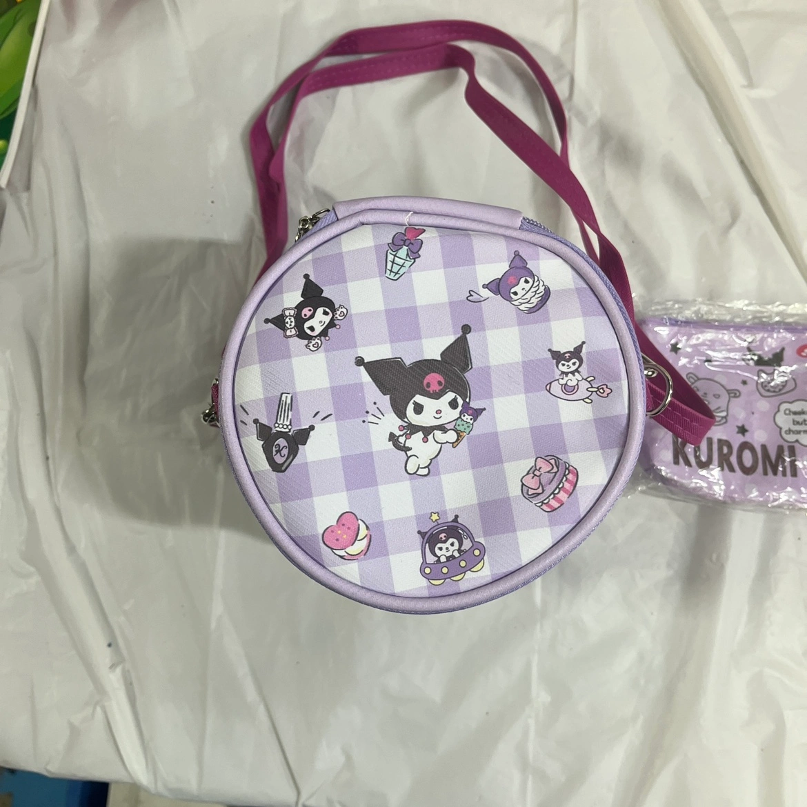This set includes a small pencil case and a larger crossbody bag . Both feature the character Kuromi.