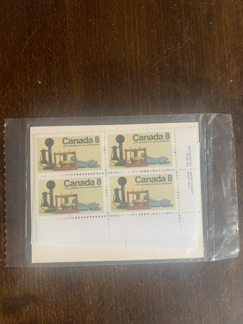 Set of four corner blocks from the 1974 "The Telephone 1874-1974" issue. Each block contains four stamps. The stamps are in mint never hinged condition. Designed in Toronto by Ray Webber Issue date: July 26,1974