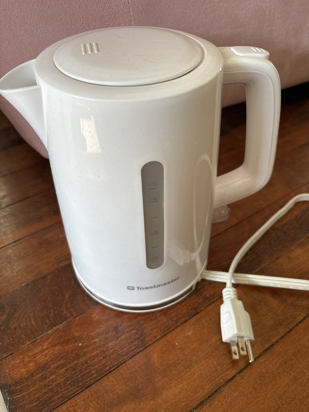 White electric kettle with a 1.7 L capacity. Comes with a cord.