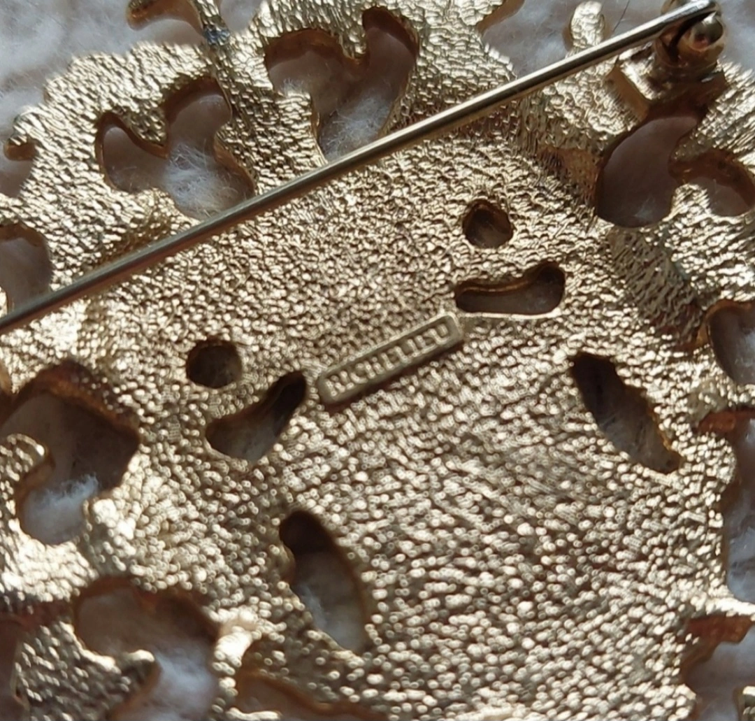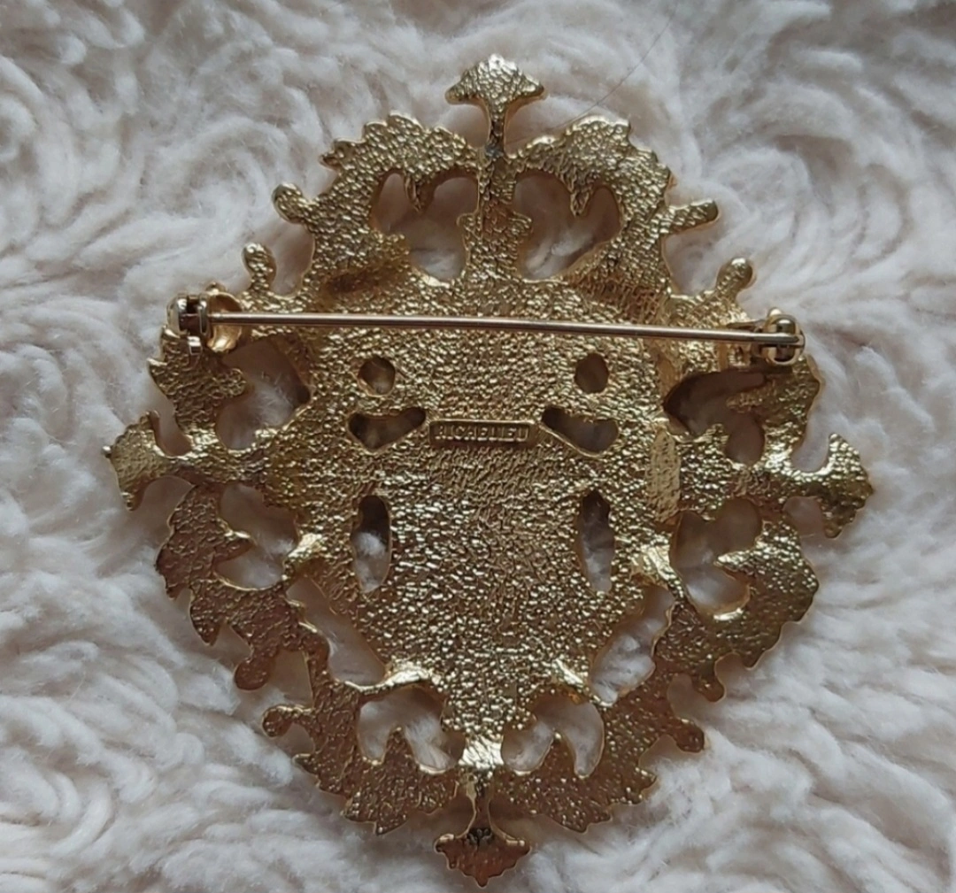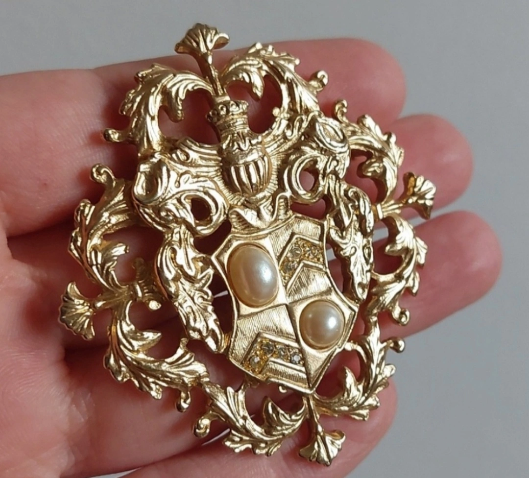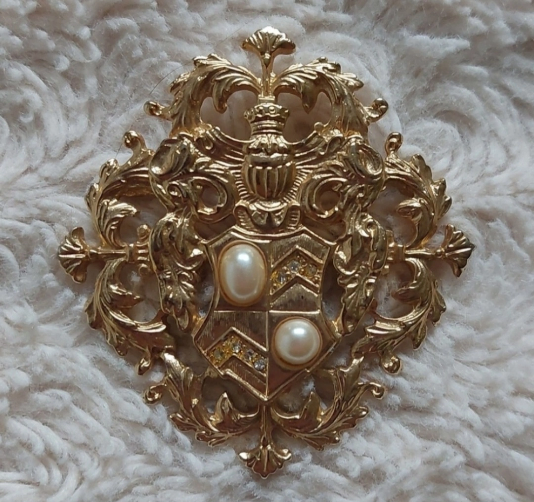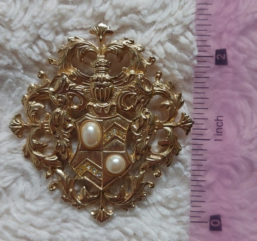 Faux pearl rhinestone coat of arms gold tone brooch.