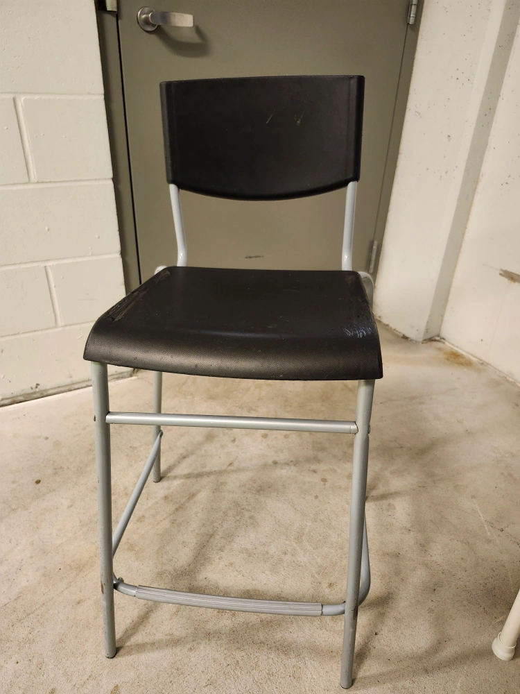 Black chair with back, and metal legs. Works well on a kitchen island or bar. Was left in the recycling room of our building by someone moving.