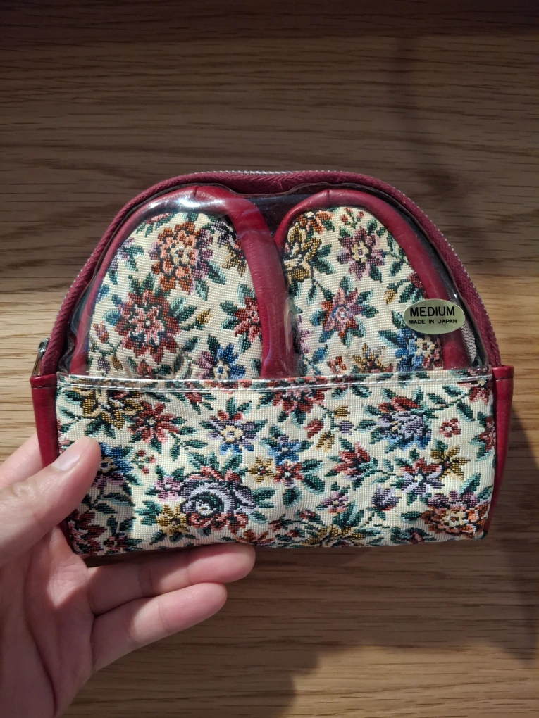 Red leather slippers with a floral tapestry design on the top. Made in Japan, size medium. Come in a small floral zippered pouch. Sole measures about 24cm