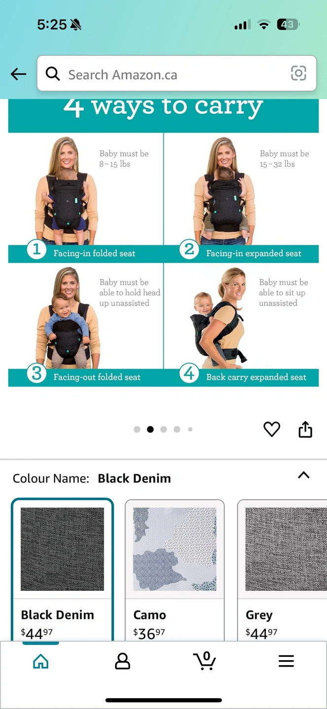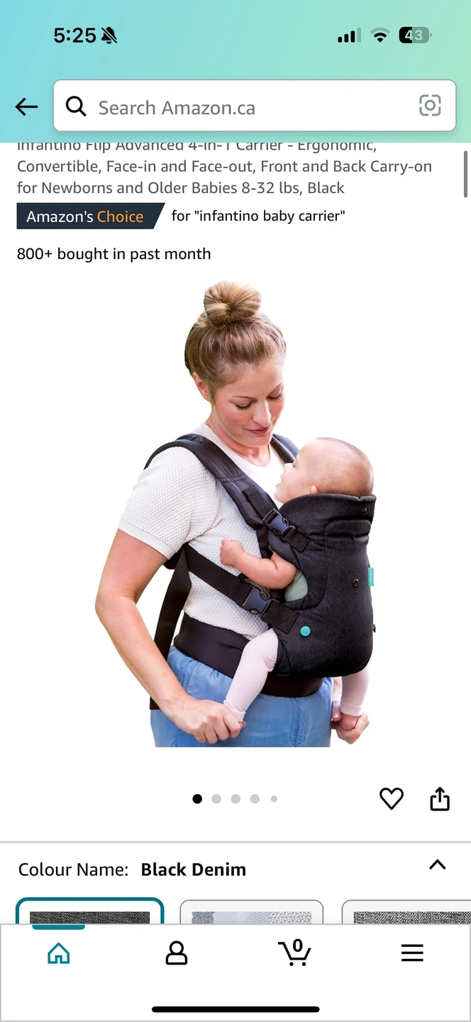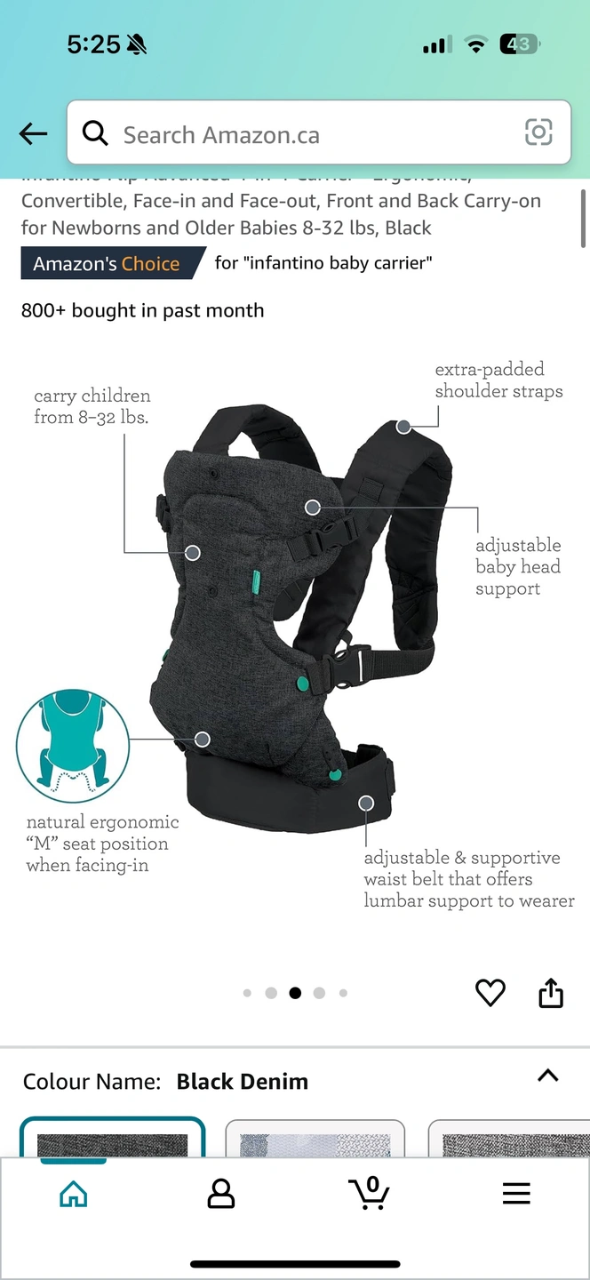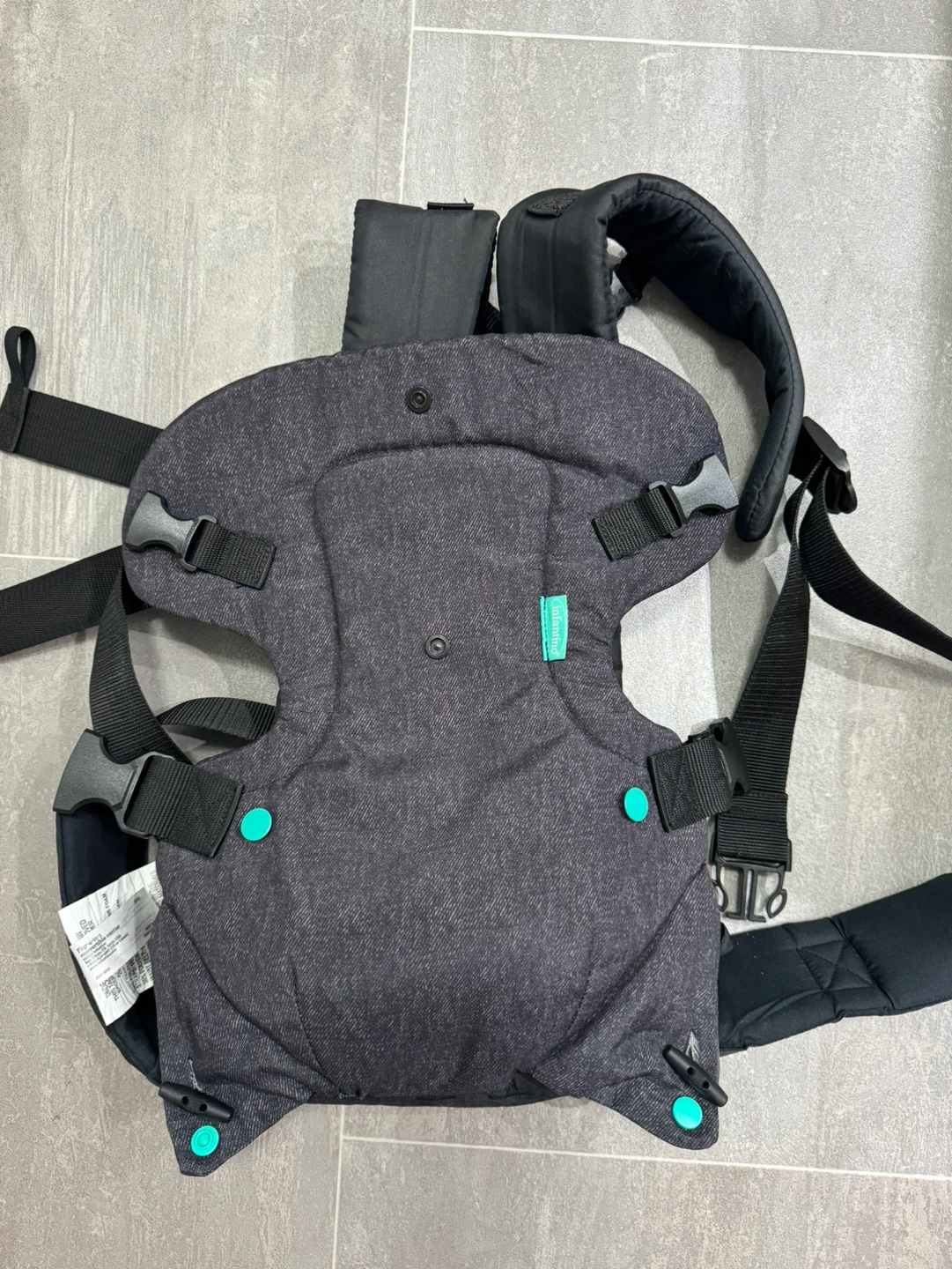 Infantino baby carrier with four carry positions ** Cash only, please ** Adjustable and ergonomic (“M” shape) Condition: good — like new Colour: black denim Retails for: $45 PU: Thompson Community Centre area Home: non-smoking, pet-friendly (dog) Item has been washed in fragrance-free detergent and laid flat to dry