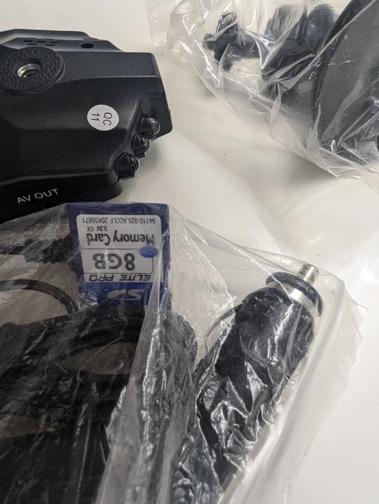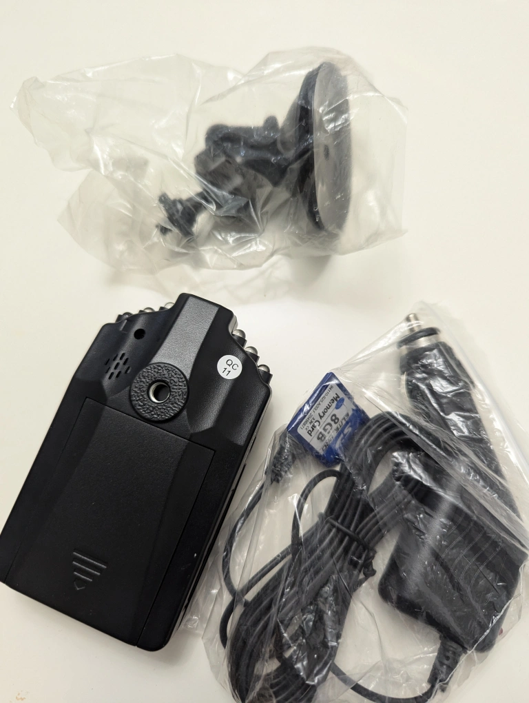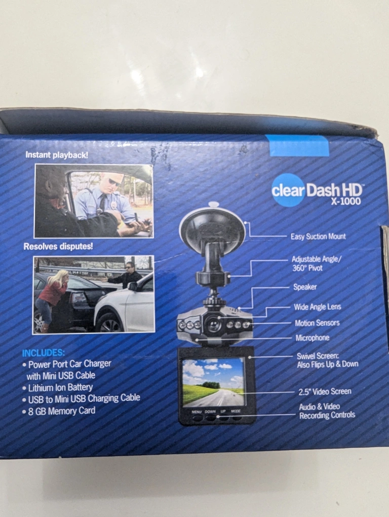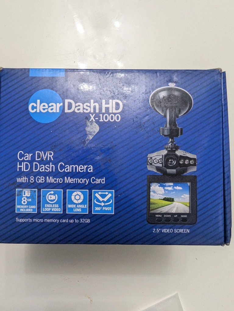 This is a Clear Dash HD X-1000 Car DVR. It comes with an 8GB micro memory card, a car charger, a USB to mini USB charging cable, open box