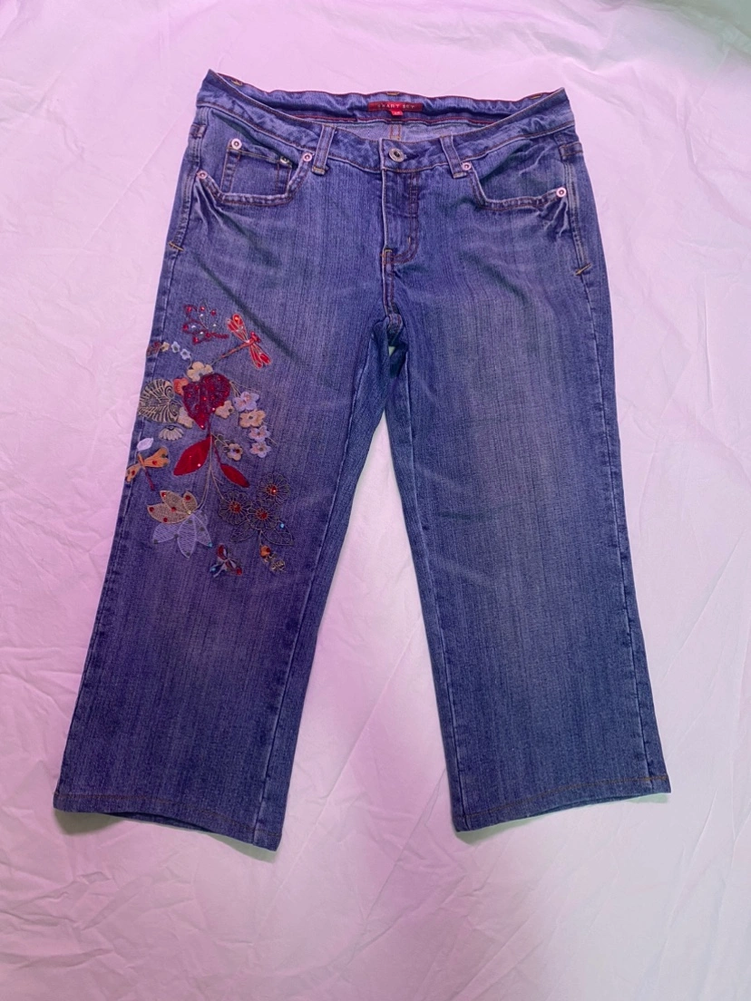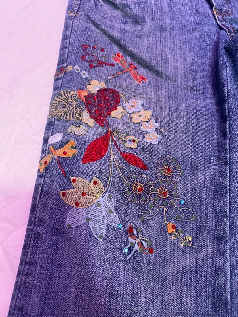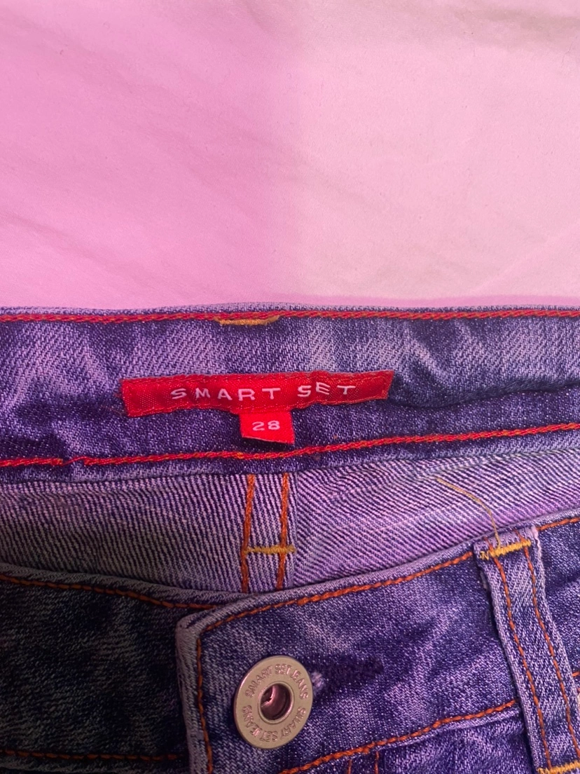 These jeans are blue denim with floral embroidery and rhinestones on the left leg. They have a red label that says "Smart Set 28".