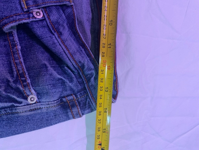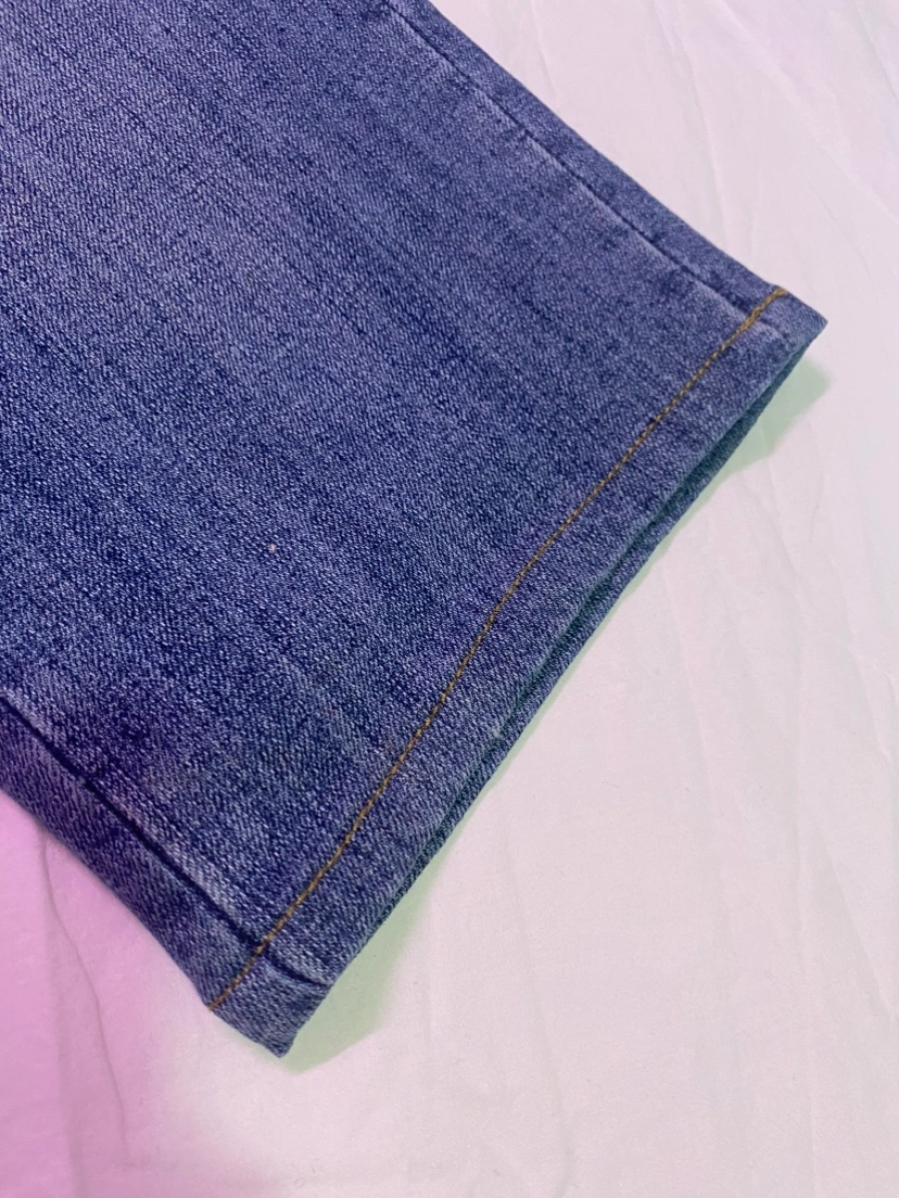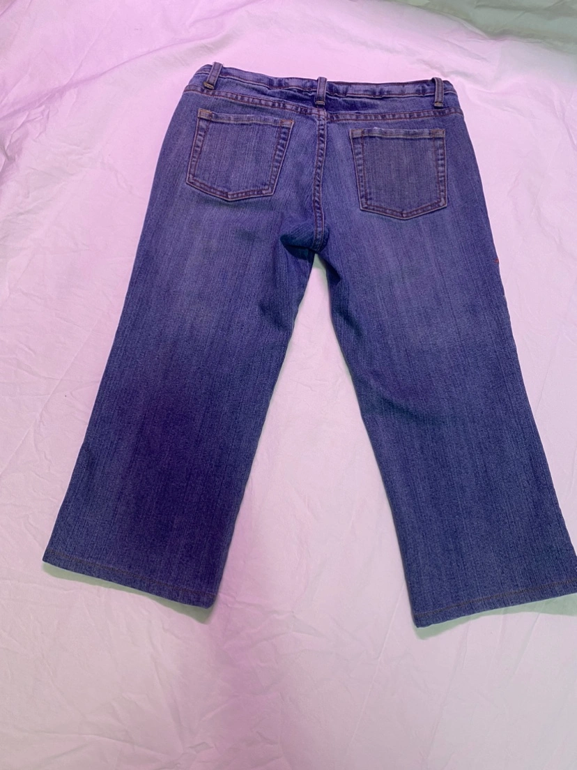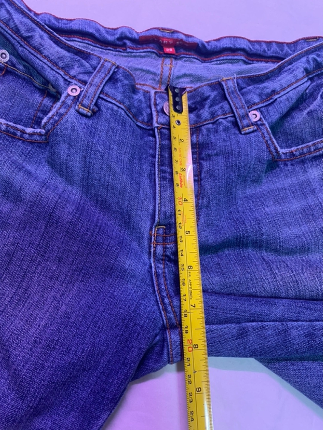 These jeans are blue denim with floral embroidery and rhinestones on the left leg. They have a red label that says "Smart Set 28".