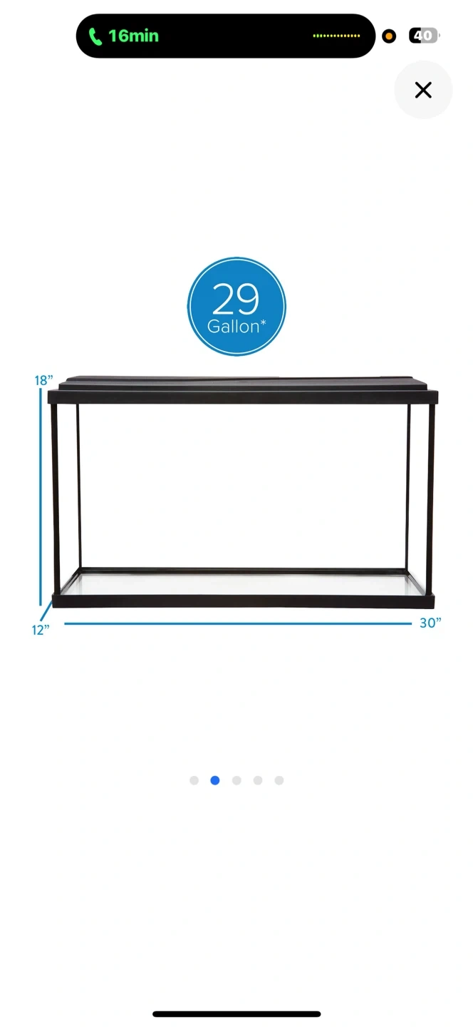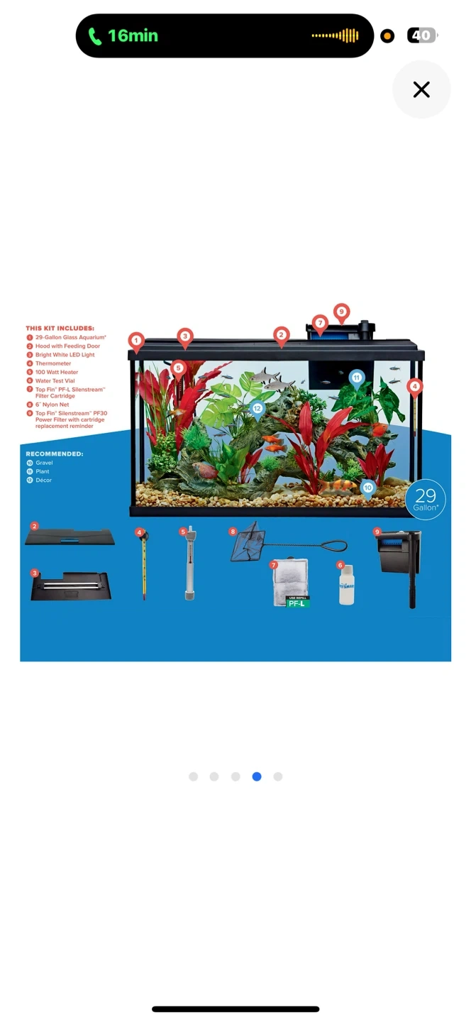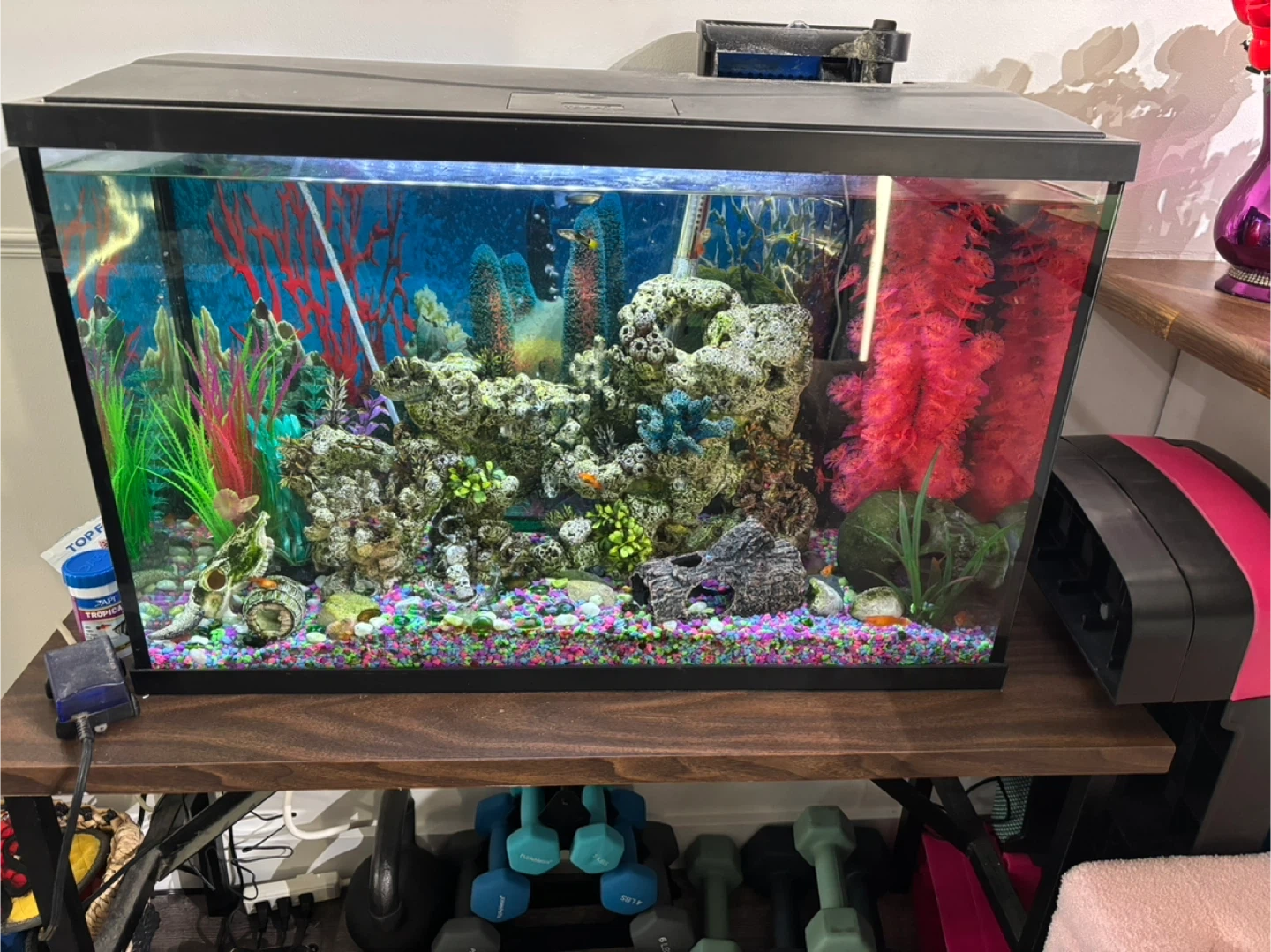 Selling a 29-gallon aquarium kit! It comes with a hood with a feeding door, a 100-watt heater, decor, and a Top Fin filter. Dimensions are 30" x 12" x 18"