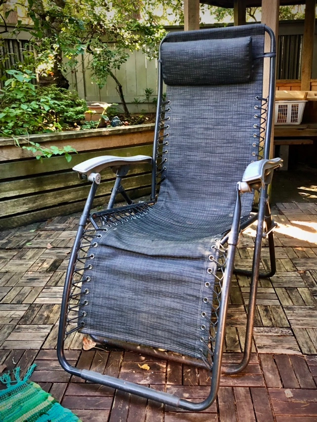 A black zero gravity recliner with a headrest. It folds for easy storage and transport. It is made of metal and fabric. It is in okay condition, but has some wear and some rust. Comfortable though and still has life left in it!