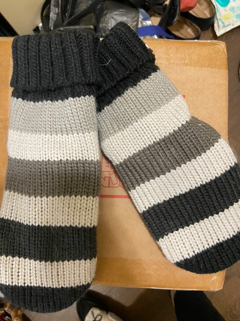 Striped knitted mittens. Grey, black and white. One size fits most. Made by HBC.