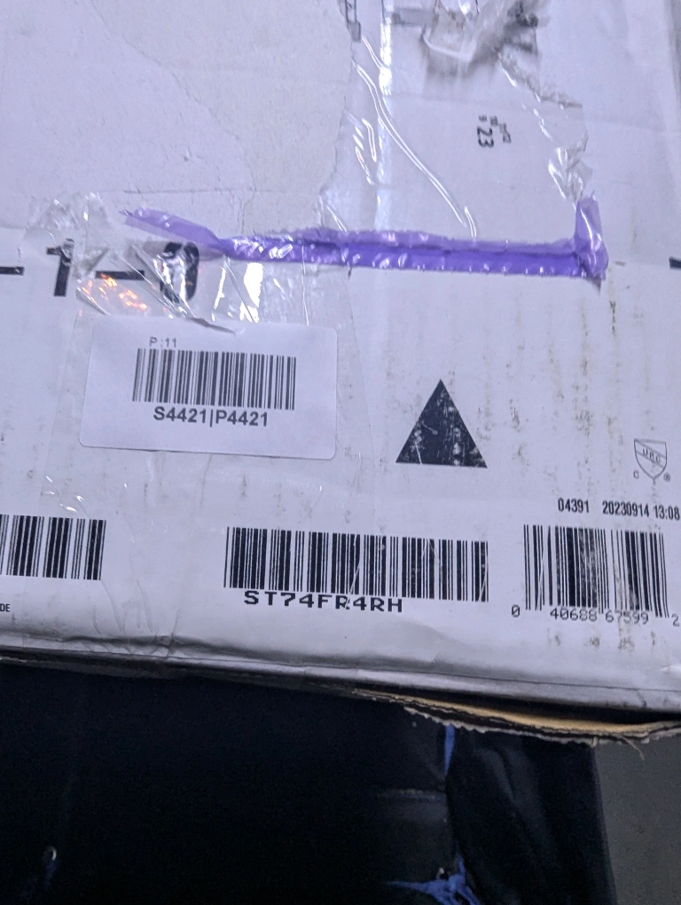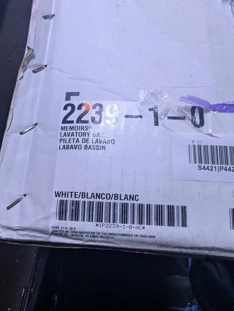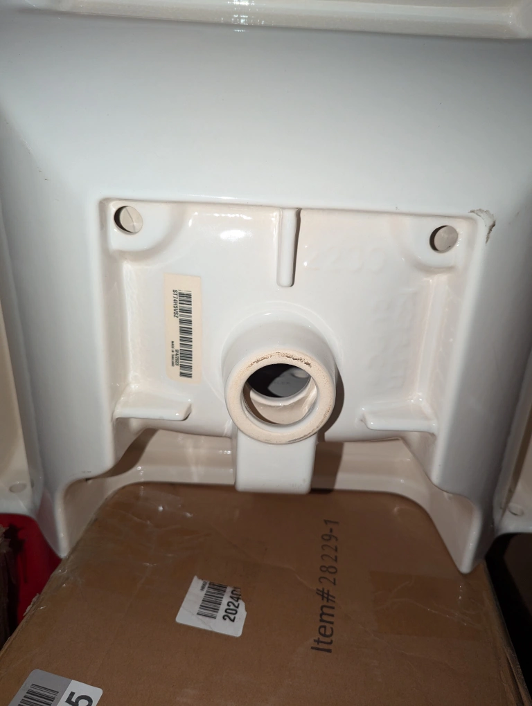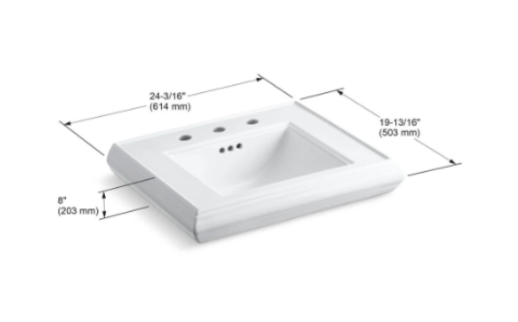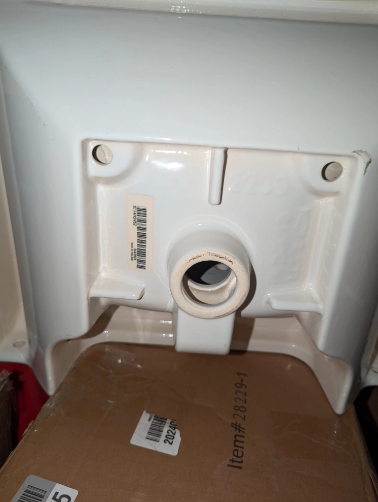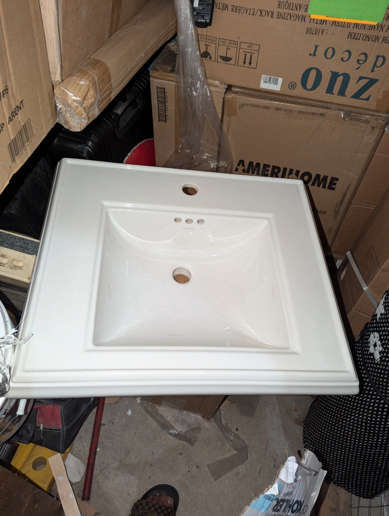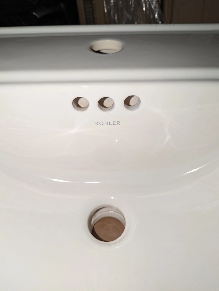 White bathroom sink with three holes for faucets. It has a small crack on the side. It is approximately 24 inches long and 18 inches wide. It is missing the drain plug. It is in good condition other than the crack. Open box