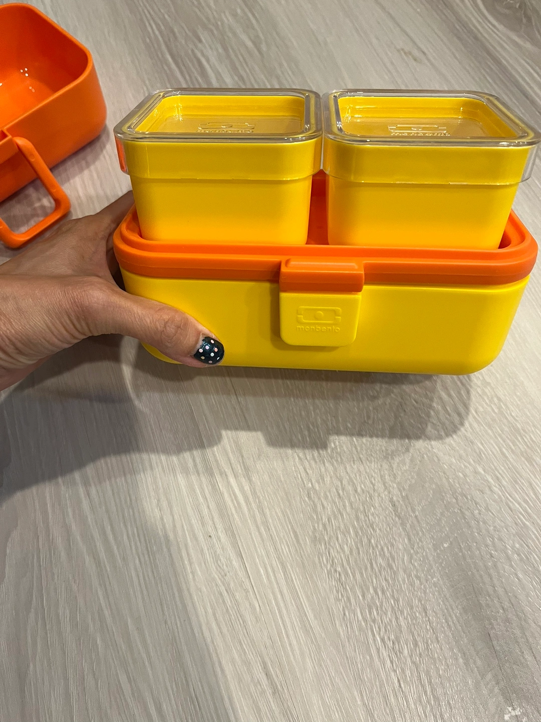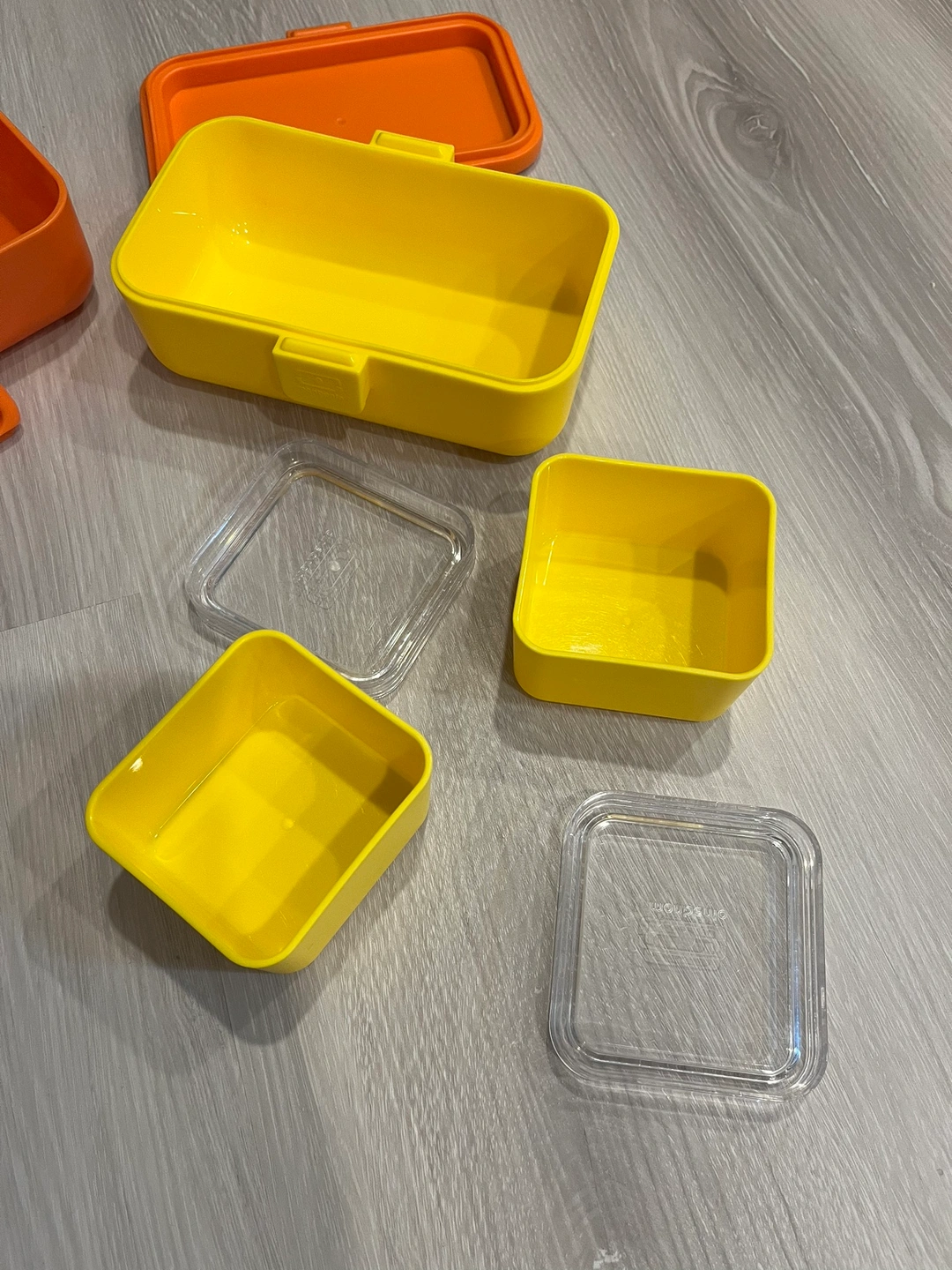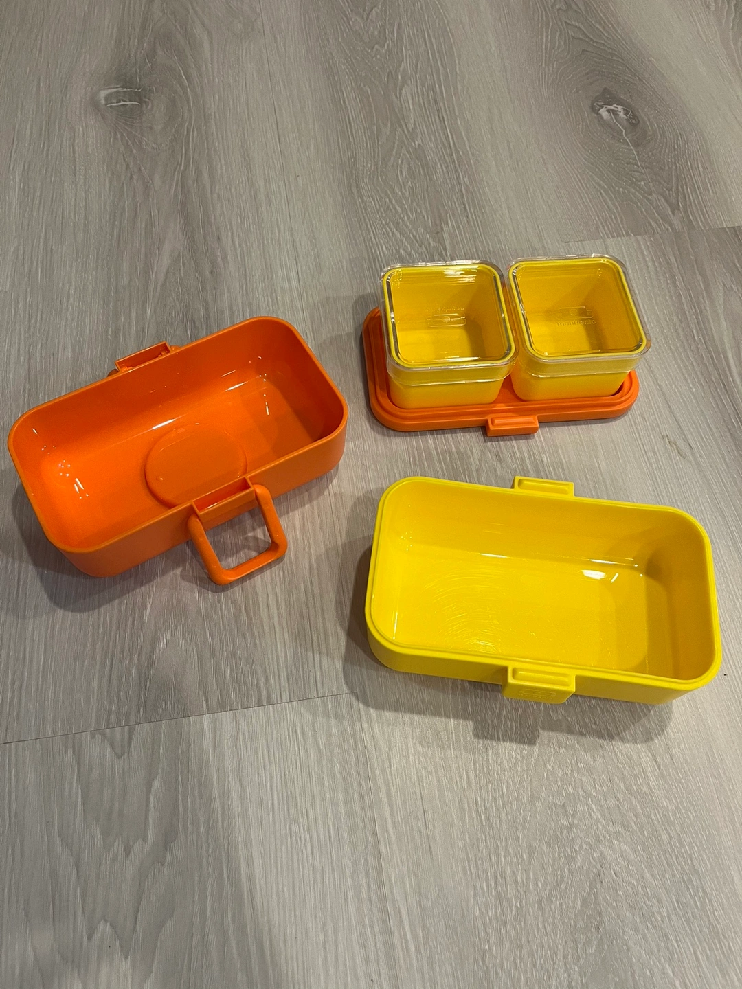 Smoke free pet free home Pick up only. Yonge & Steeles Item brought to driveway A set of 3 yellow and orange lunchboxes with lids. Includes one large container and two square containers. Great lunch box for little hands - easy to open or close. Bright colours Perfect for snacks on the go or portion control.
