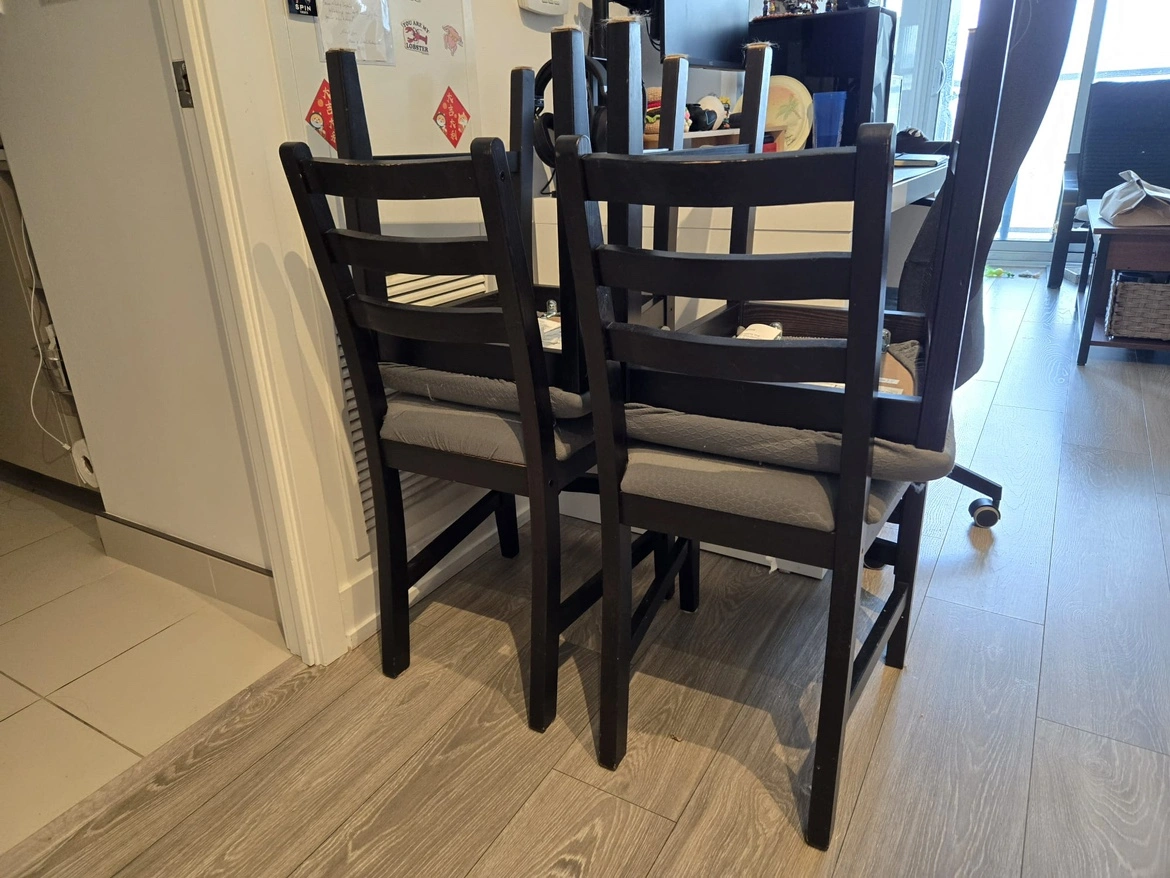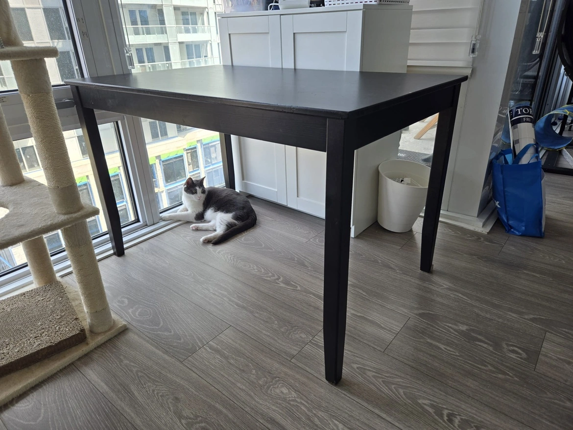 30x47 dining table with 4 chairs. The table top has aesthetic damages at the corners, but looks great when covered with a table cloth! The chair coverings are relatively new, but options are available on Amazon. Pick up in Liberty Village.