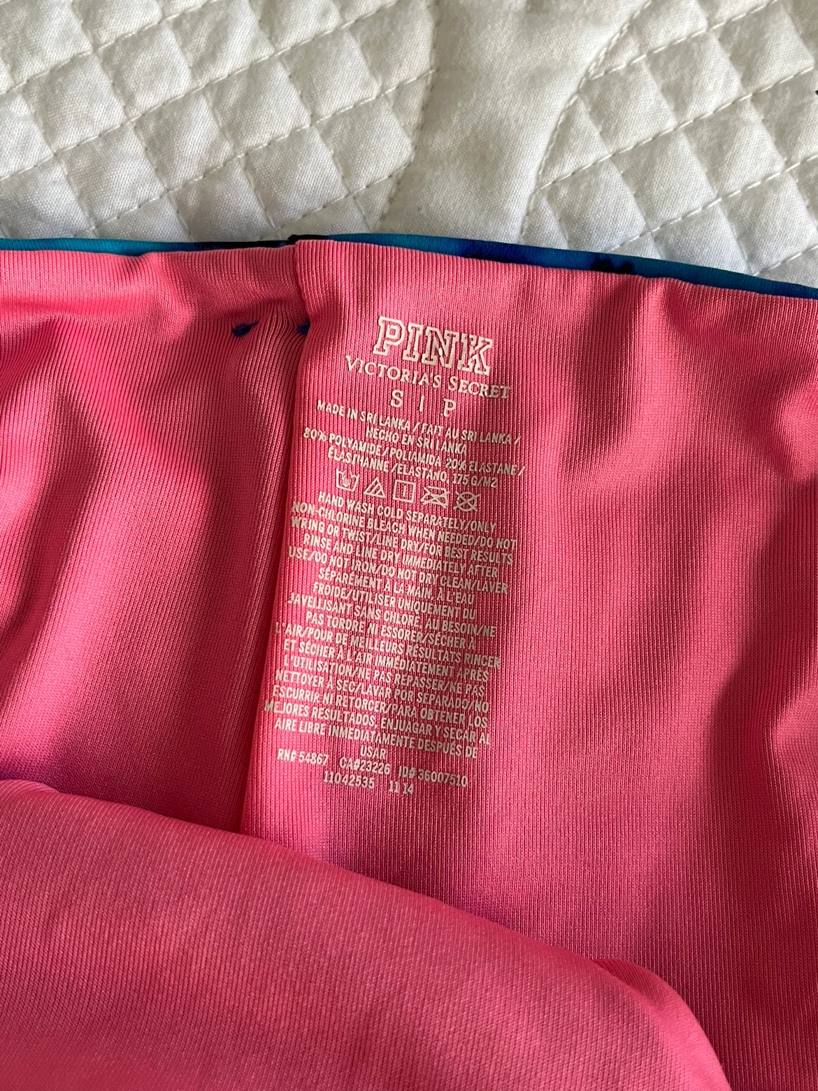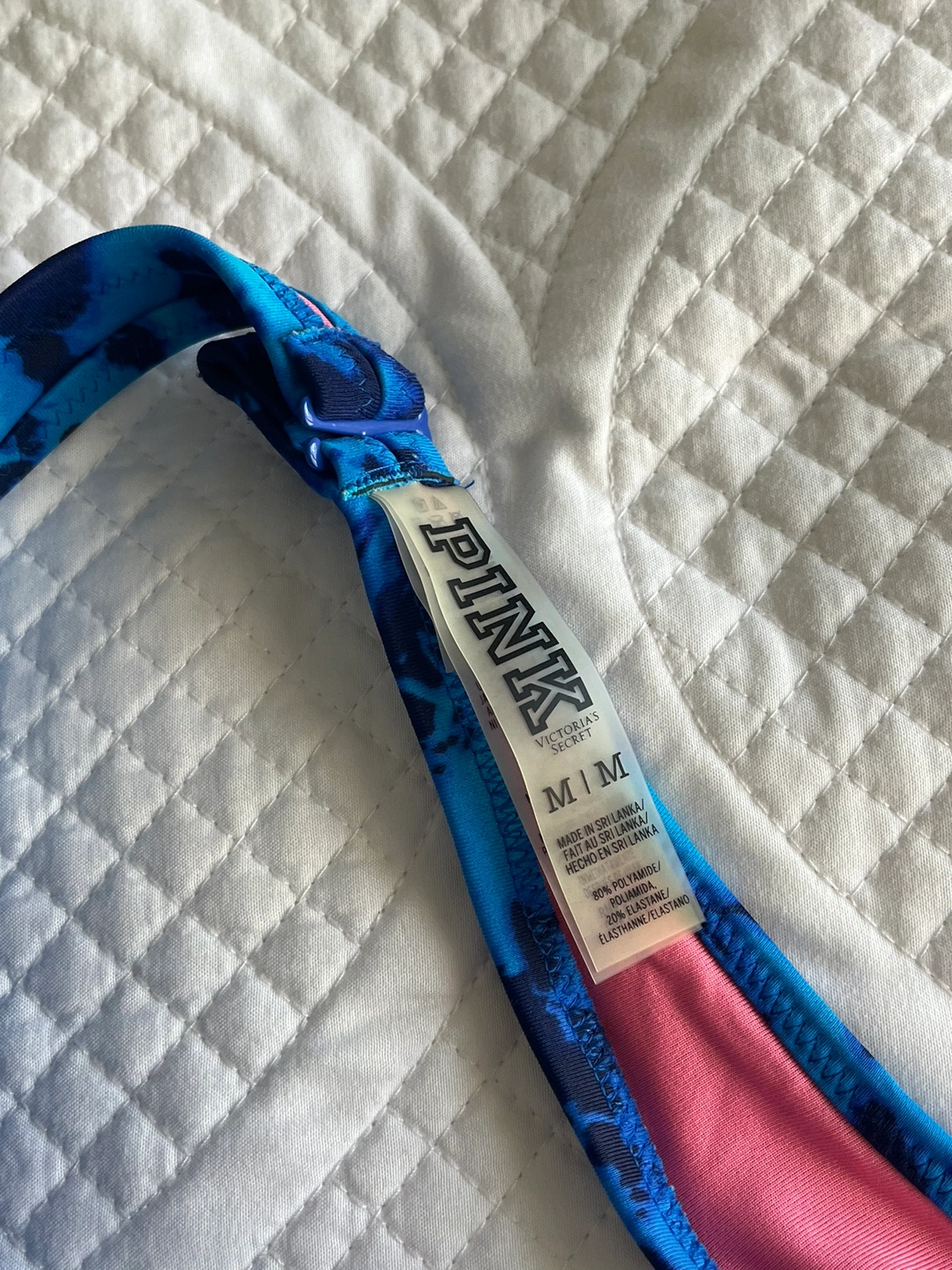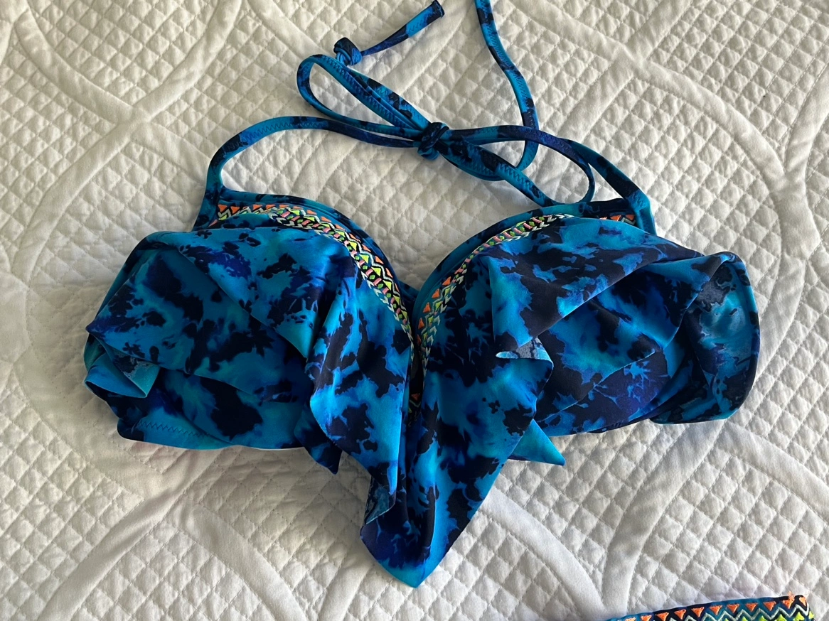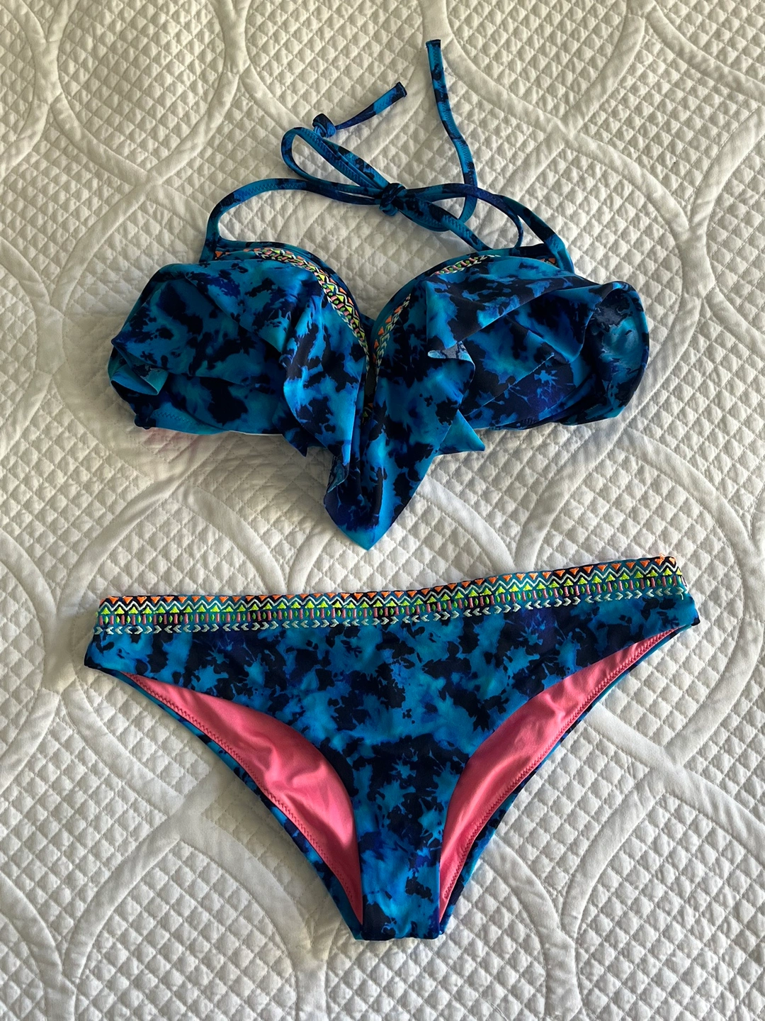Blue and black tie dye bikini with pink lining. Features a ruched top with adjustable straps and a high-waisted bottom. Bikini Top: Size Medium Bikini Bottom: Size Small ⭐️Major intersection for pick up is Avenue Road and Eglinton⭐️